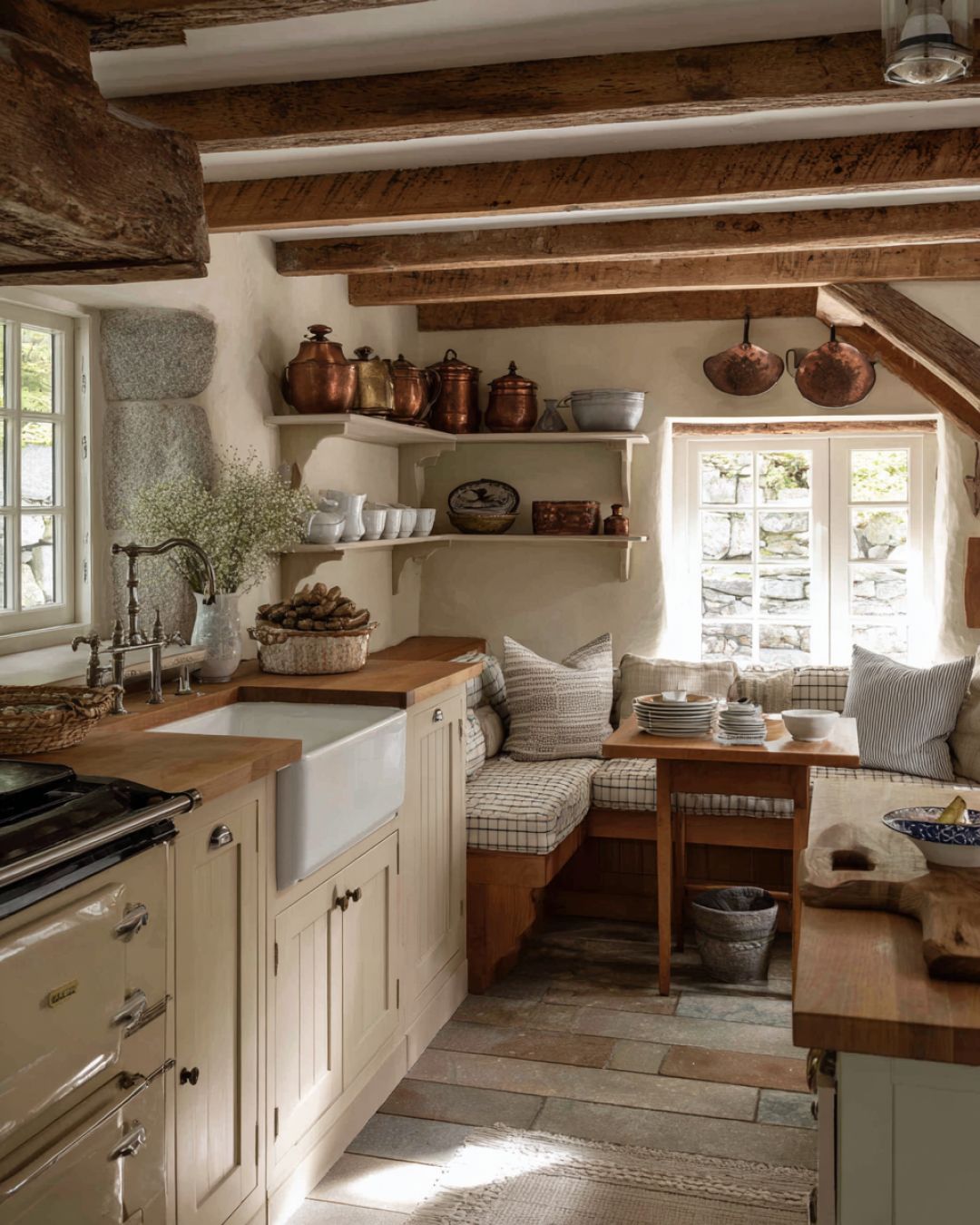 The kitchen is a charming blend of old and new, with modern appliances seamlessly integrated into a design that honors traditional craftsmanship. Stone countertops and wooden cabinetry provide ample storage and workspace, while a farmhouse sink and vintage-inspired fixtures add to the kitchen's timeless appeal. Open shelving displays an assortment of earthenware and copper pots, infusing the space with warmth and personality. A quaint breakfast nook, with a small table and cushioned seating, offers a cozy spot for casual meals and morning coffee, making the kitchen a functional and inviting heart of the home.