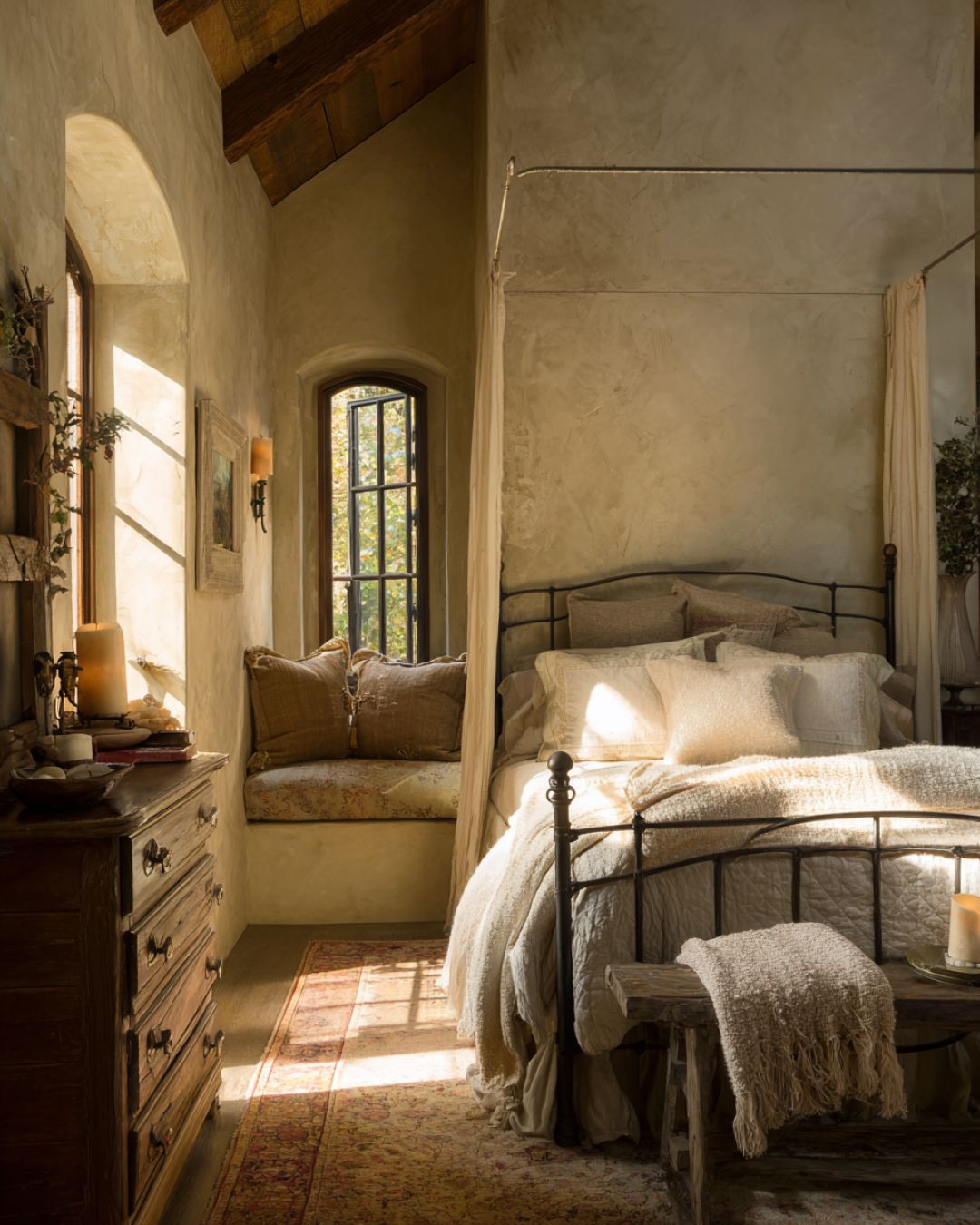 The bedroom offers a serene retreat, with soft textiles and gentle lighting creating a soothing atmosphere. A wrought iron bed, draped in luxurious linens and soft throws, invites restful slumber, while antique wooden furniture provides storage and style. The walls are painted in muted tones, enhancing the room's calming effect, while an area rug adds warmth and texture underfoot. A small window seat, adorned with plush cushions, provides a quiet nook for reading or reflection, making the bedroom a tranquil haven within the cottage.