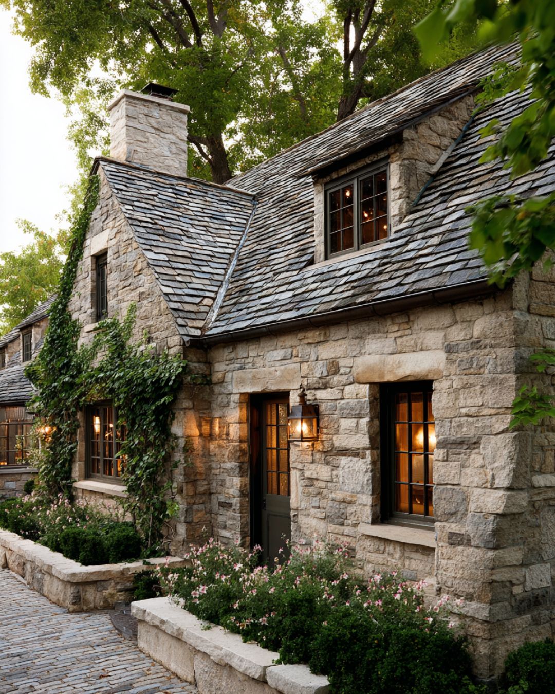 The exterior of this old world stone cottage is a testament to the art of masonry, with each stone carefully selected and placed to create a textured facade that exudes character and charm. Narrow windows punctuate the stonework, allowing just the right amount of natural light to filter through while maintaining a sense of privacy and intimacy. The sloping roof, covered in weathered slate tiles, adds to the cottage's storybook appearance, while creeping ivy and flowering plants frame the entrance, offering a welcoming burst of color. A cobblestone path leads to the front door, inviting visitors to step inside and experience the warmth and wonder that await within.