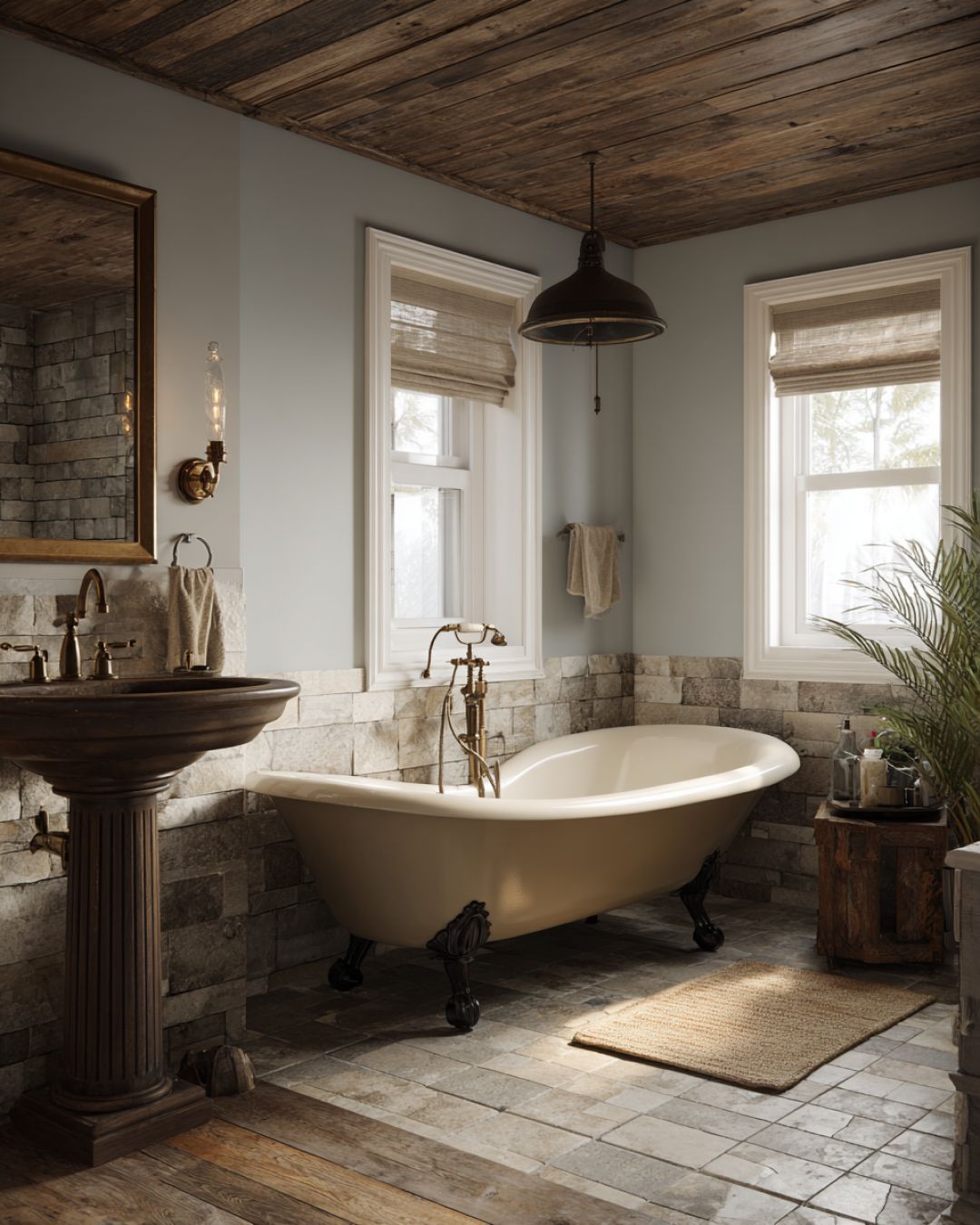 The bathroom is a study in rustic elegance, with stone tiles and wooden accents creating a harmonious blend of textures. A clawfoot bathtub serves as the centerpiece, offering a luxurious escape, while a vintage-style pedestal sink and brass fixtures add to the room's timeless charm. Soft, natural light filters through frosted windows, illuminating the space without sacrificing privacy. The color scheme of soft neutrals and earth tones enhances the bathroom's calming atmosphere, making it a perfect place to unwind and rejuvenate.