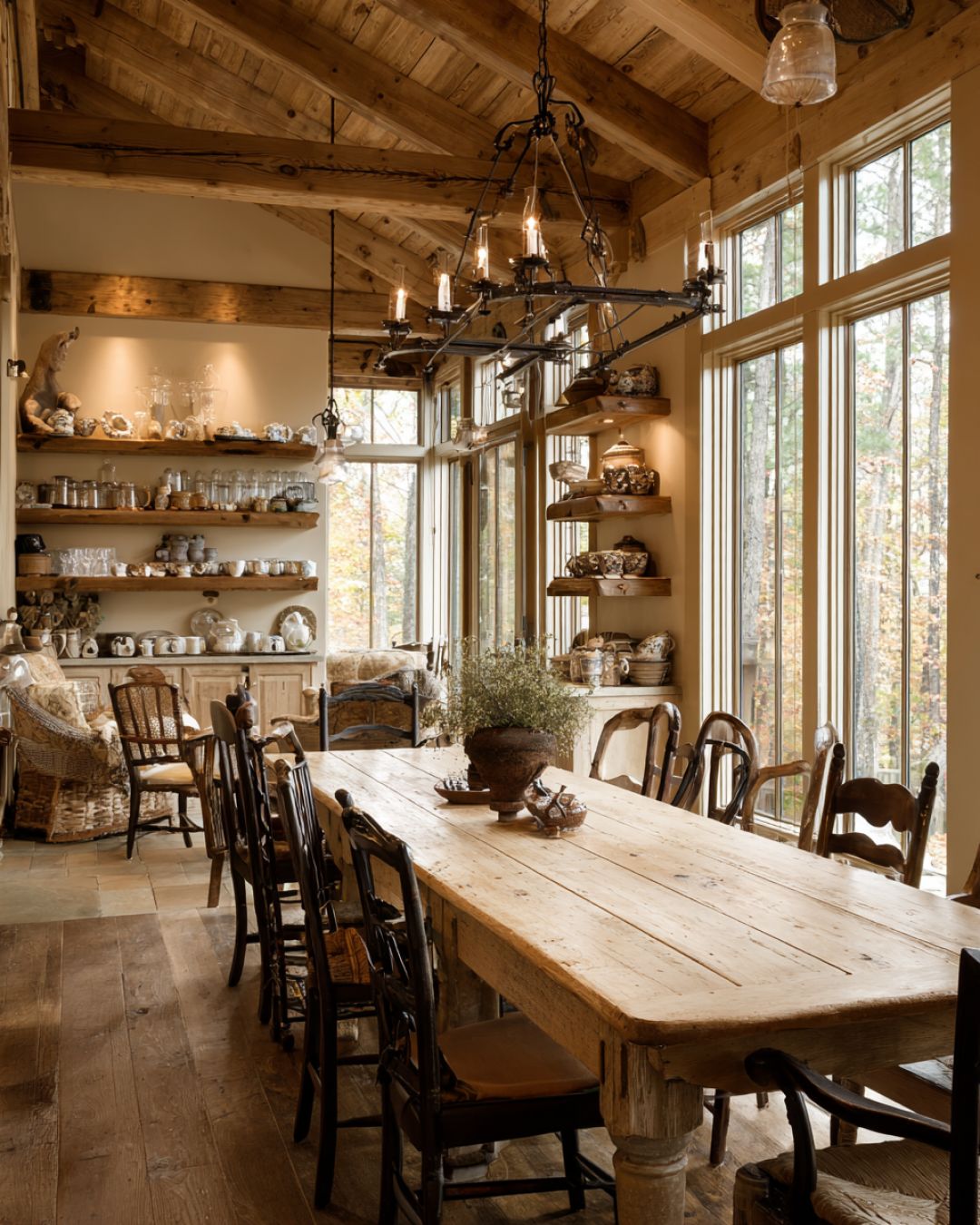 The dining area continues the theme of rustic elegance, with a large wooden table serving as the centerpiece of the room. Surrounded by mismatched chairs, each with its own story to tell, the table invites guests to gather for meals and shared moments. Overhead, an iron chandelier casts a warm glow, its design reminiscent of a bygone era. The walls are lined with built-in shelves, showcasing an array of vintage crockery and glassware that add character and charm to the space. Large windows provide views of the surrounding landscape, bringing the beauty of nature indoors while enhancing the overall ambiance of the dining area.