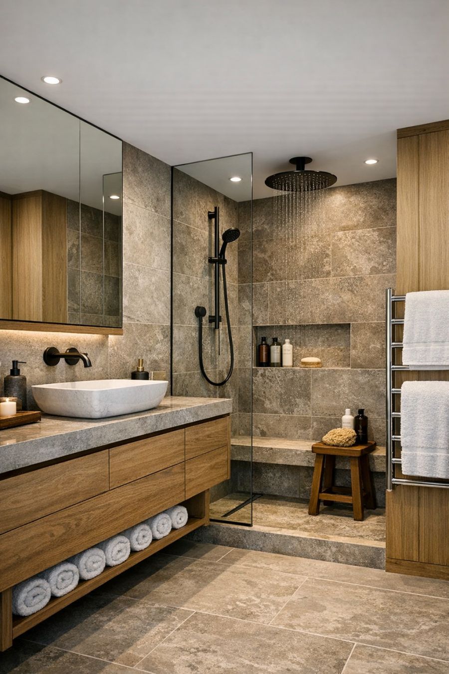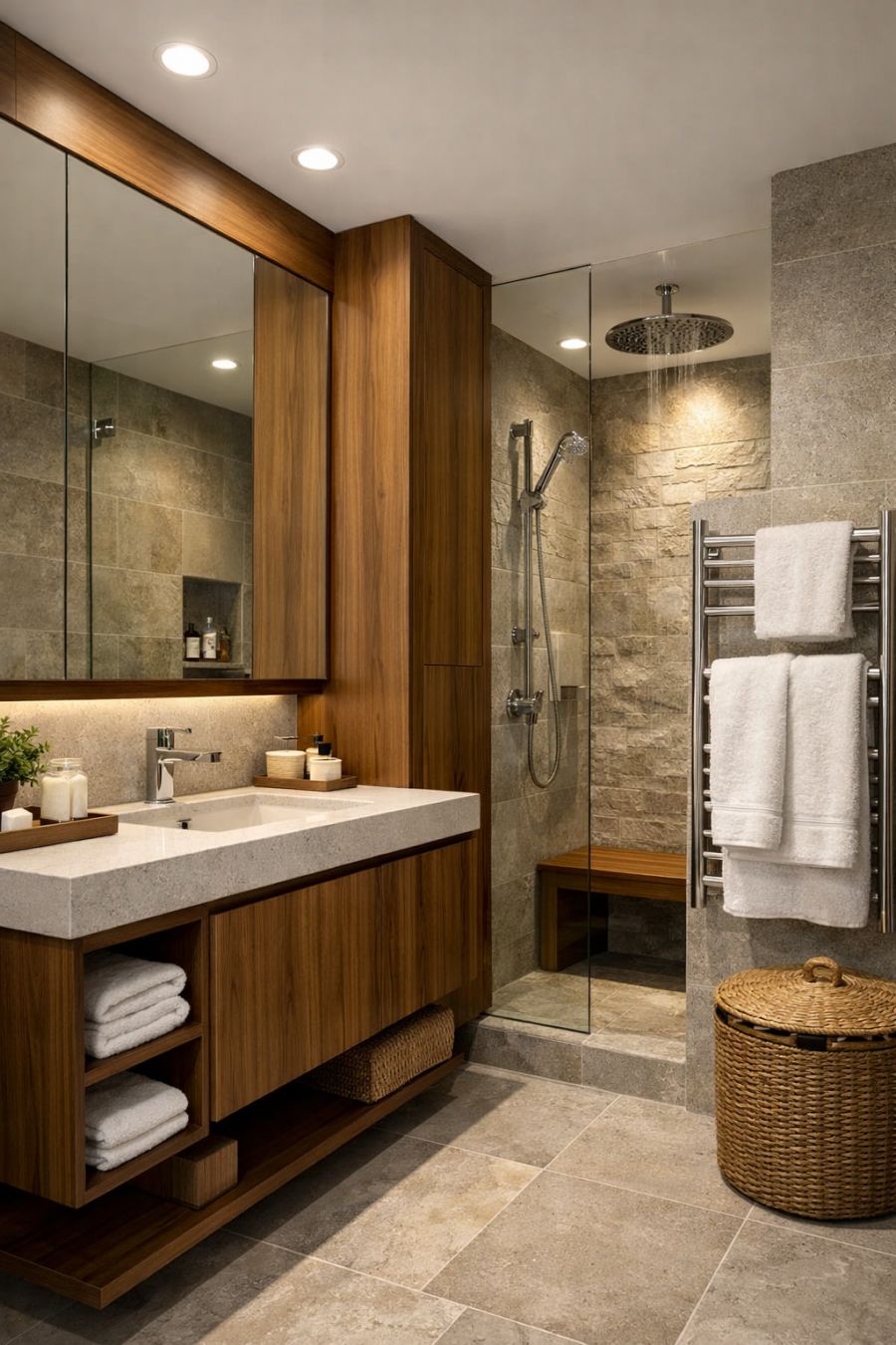 The bathroom exudes a spa-like quality, with clean lines and a calming color scheme. High-quality materials such as stone and wood are used throughout, offering a sense of luxury and durability. The fixtures, including a sleek vanity and rainfall shower, are both functional and stylish, contributing to the bathroom's modern aesthetic. Thoughtful touches, like heated towel racks and ample storage, ensure the space is both practical and comfortable for daily use.