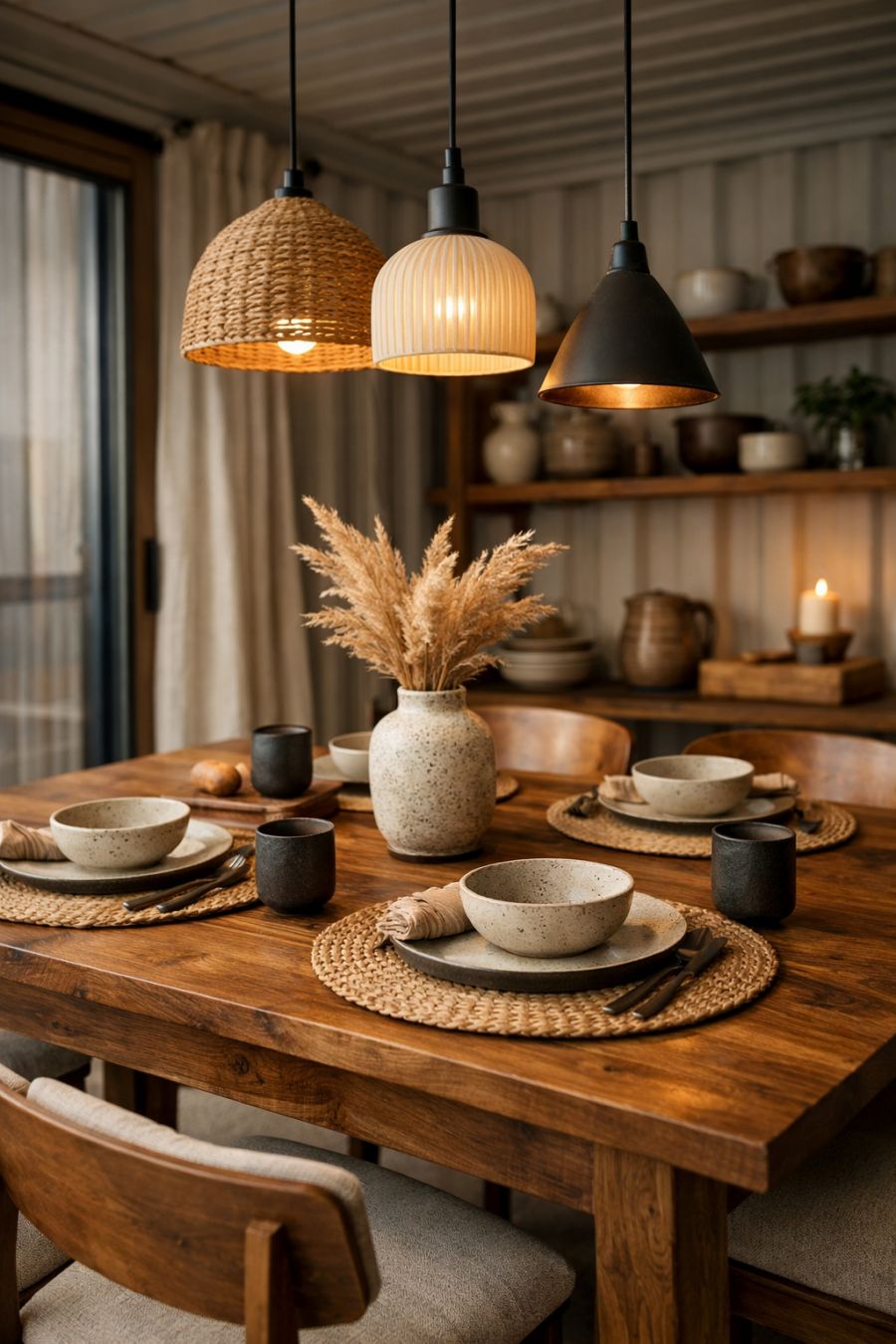 The dining area is an elegant space that continues the theme of warmth and simplicity. A handcrafted wooden dining table takes center stage, surrounded by comfortable chairs that invite long, leisurely meals. The lighting is soft and ambient, with pendant lights hanging above the table to create an intimate setting. Natural textures and materials, such as woven placemats and ceramic dishware, add a tactile dimension that enhances the overall aesthetic and experience of the space.