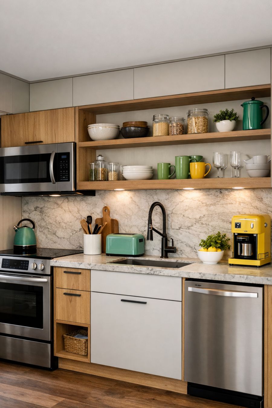 In the kitchen, functionality meets style with sleek cabinetry and state-of-the-art appliances seamlessly integrated into the design. The countertops are made of polished stone, providing a durable and attractive surface for meal preparation. Open shelving offers both practical storage and a chance to display beautiful kitchenware. The color scheme remains neutral, with subtle pops of color introduced through small appliances and decor, maintaining the home's cohesive design language.