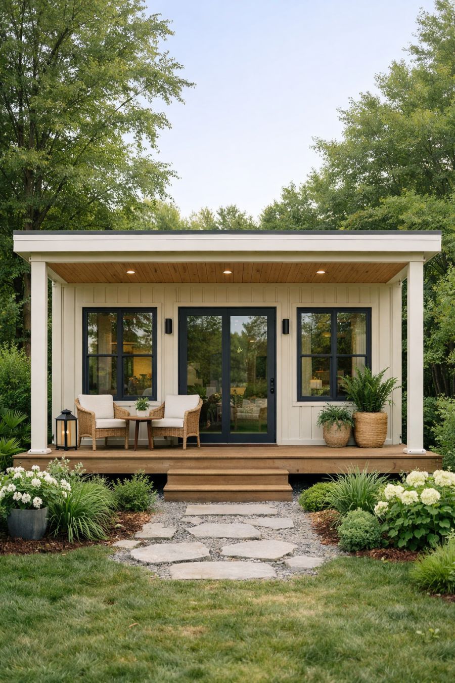The exterior of this charming container home is a sight to behold, with soft linen-colored siding that exudes warmth and tranquility. The sheltered porch, an inviting feature, provides a peaceful space to relax and enjoy the outdoors, rain or shine. Large windows adorn the facade, allowing natural light to flood the interior while offering picturesque views of the surrounding landscape. The minimalist design is complemented by lush greenery that frames the home, creating a seamless connection between the structure and nature.