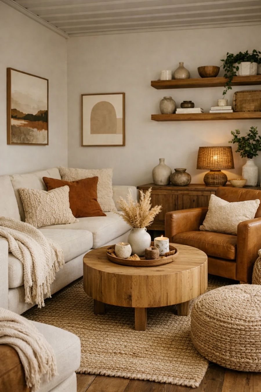Stepping into the living area, you're greeted by an ambiance that feels like a warm hug. The interior design features a neutral color palette with accents of earthy tones, creating a cozy and inviting atmosphere. Plush seating arrangements are strategically placed to maximize comfort and encourage relaxation. The walls are adorned with minimalist artwork and shelves holding carefully curated decor, contributing to the room's harmonious balance and tranquil vibe.
