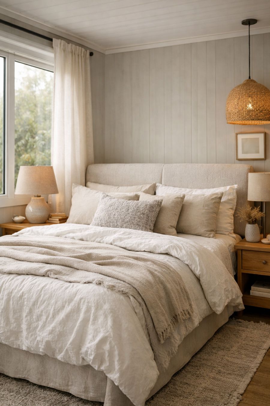 The bedroom is a serene sanctuary designed for rest and relaxation. Soft, muted tones dominate the space, with layers of textiles adding depth and comfort. A large, comfortable bed is the focal point, draped in luxurious linens that invite restful sleep. Natural light filters in through large windows, creating a bright and airy atmosphere during the day, while carefully chosen lighting fixtures provide a warm glow in the evenings. The minimalist decor ensures the room remains uncluttered and peaceful.