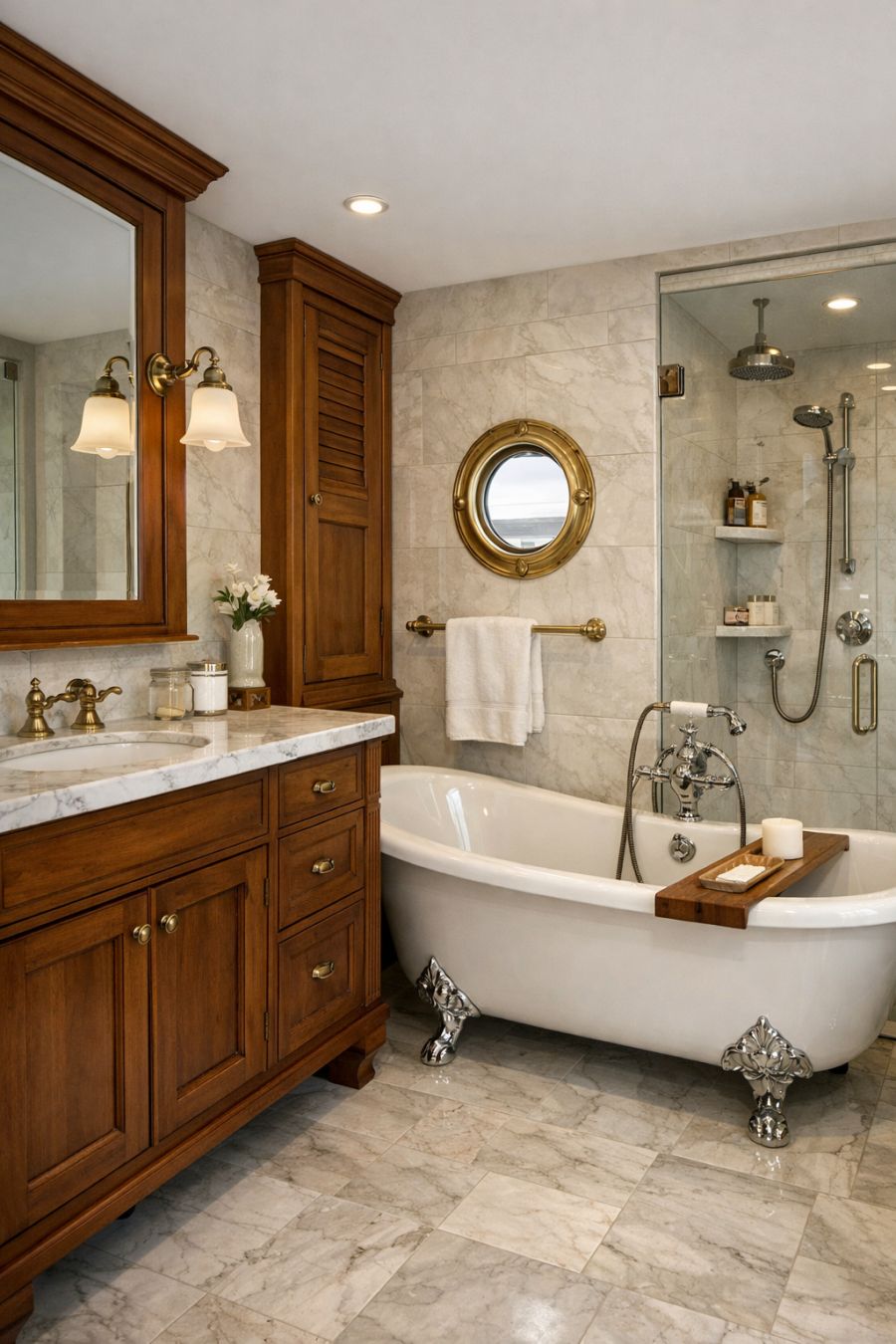 The bathroom is a study in elegance and functionality, featuring a classic clawfoot tub as its focal point. Marble tiles in soft, neutral tones cover the floors and walls, creating a clean and sophisticated look. The vanity is crafted from rich wood, topped with a marble countertop and adorned with vintage-style fixtures. A spacious walk-in shower and ample storage complete the space, ensuring it meets all practical needs while maintaining a luxurious feel. The overall atmosphere is one of calm and refinement.