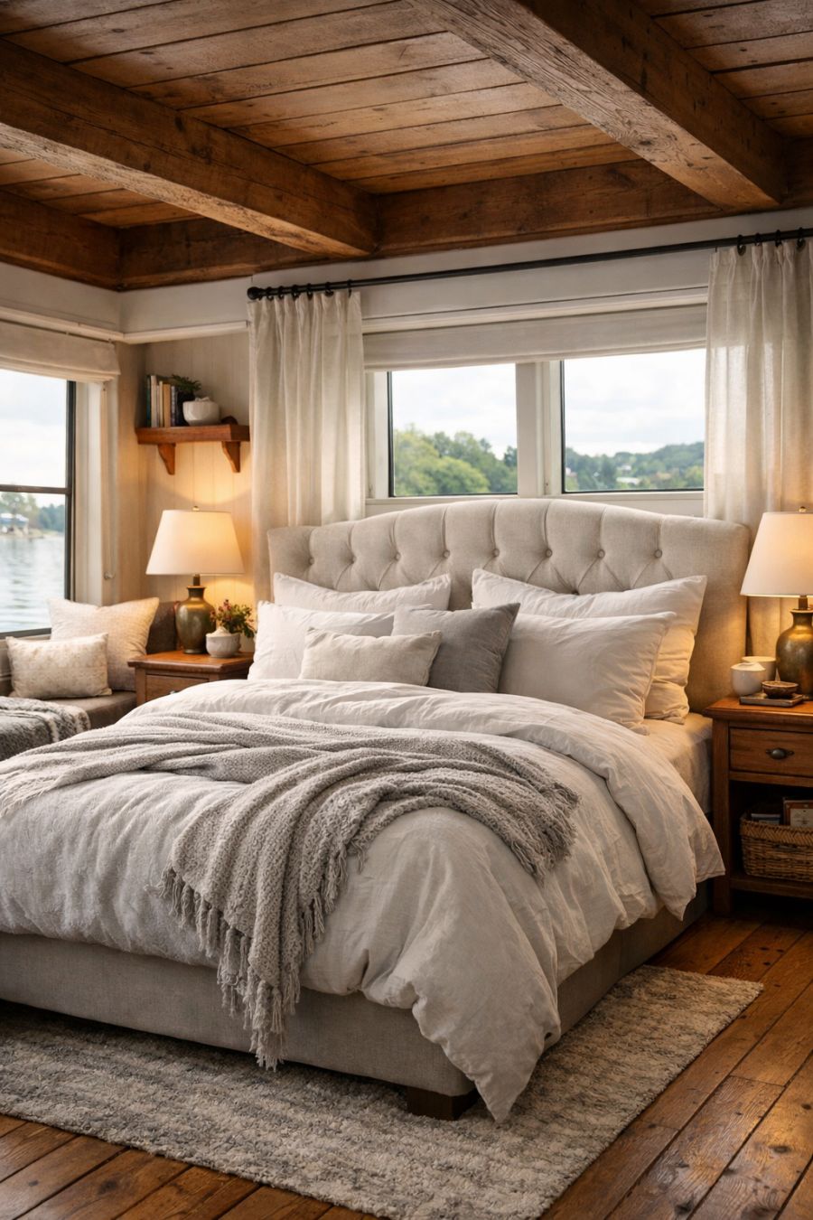 The bedroom is a sanctuary of comfort, designed to offer restful nights and gentle awakenings. The centerpiece is a large, plush bed with an upholstered headboard, flanked by elegant bedside tables. Soft, layered linens in a palette of whites and grays create a serene atmosphere, inviting relaxation. Wooden floors and exposed beams add a rustic touch, while large windows ensure the room is filled with natural light. Thoughtful details, like a cozy reading nook, enhance the room's inviting charm.