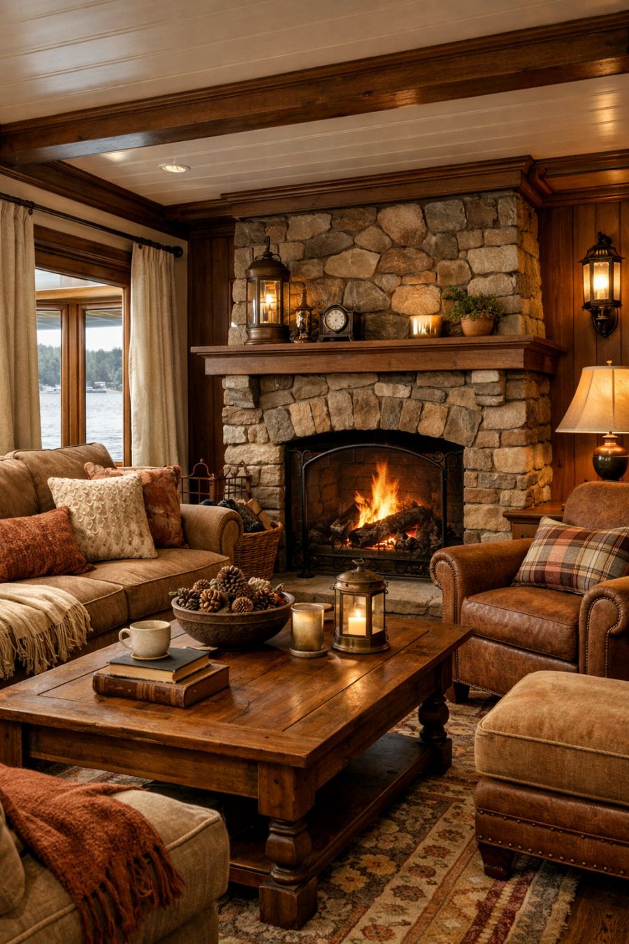 Stepping inside, the living area welcomes you with a traditional interior that exudes warmth and comfort. Inviting textures, from plush rugs to soft upholstered furniture, create a space that feels like a haven. Classic details such as crown molding and wooden beams add a touch of elegance, while a stone fireplace serves as the room's centerpiece. The color palette is a soothing mix of earth tones, enhancing the sense of tranquility and making the living room a perfect retreat from the chill outside.
