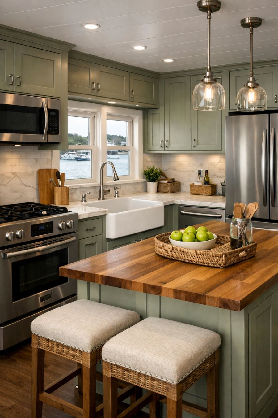 The kitchen is a blend of functionality and style, where classic design meets modern convenience. Shaker-style cabinets in a soft, muted green provide ample storage, complemented by a farmhouse sink and brushed nickel fixtures. The countertops are a mix of marble and butcher block, offering both beauty and practicality. State-of-the-art appliances are seamlessly integrated, ensuring the space is as efficient as it is beautiful. A central island provides additional workspace and a place for casual dining.