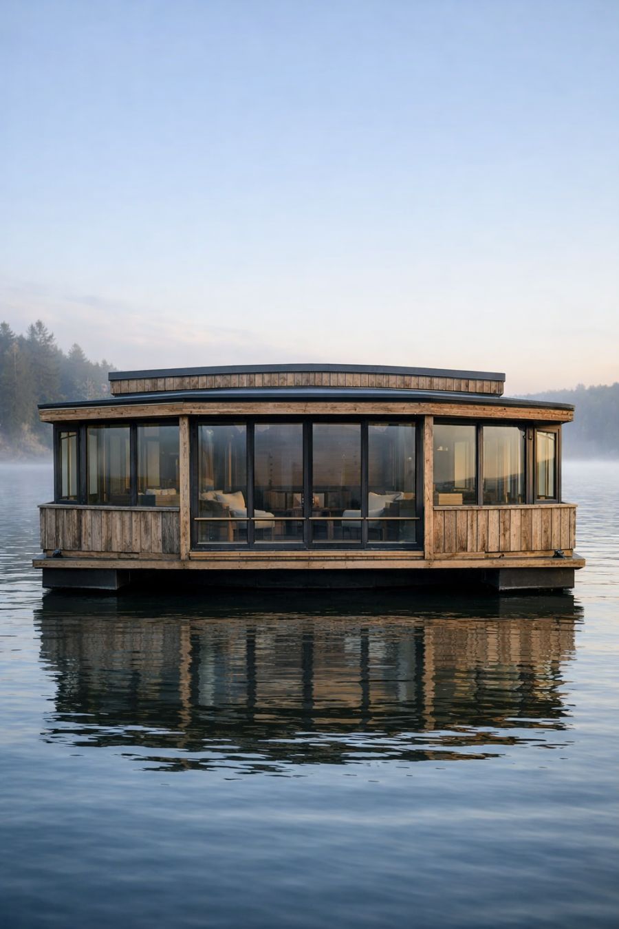 Imagine a home that marries the serenity of a winter porch with the adventure of a houseboat—this is the concept behind the stunning single-story winter porch houseboat. Conceived as a tranquil escape, this design envisions a dwelling that sits low and sheltered, blending harmoniously with its natural surroundings. The idea is to create a home that offers warmth and comfort even in the coldest months while floating peacefully on gentle waters. As a piece of concept art, this design invites you to envision a lifestyle that combines rustic charm with modern elegance.