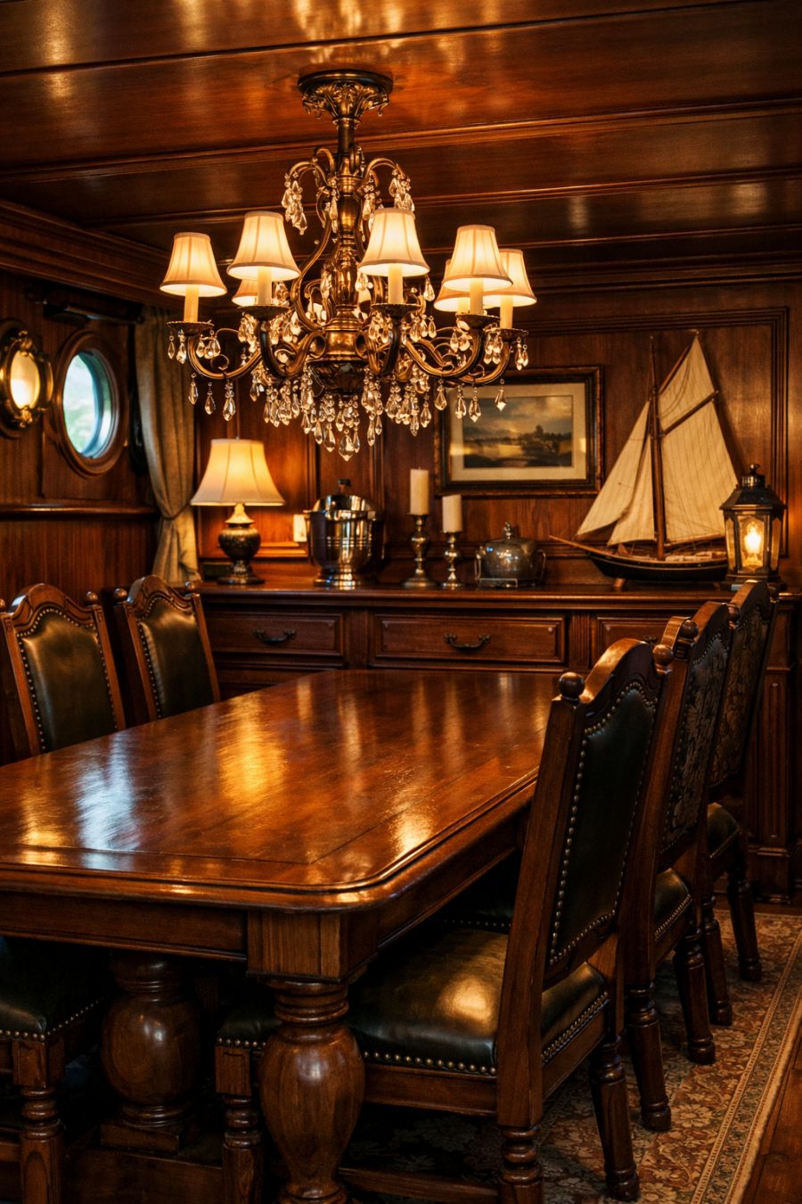 The dining area continues the theme of traditional elegance with a large wooden table at its heart, surrounded by high-backed chairs that invite long, leisurely meals. A vintage chandelier hangs overhead, casting a warm glow that highlights the rich textures of the room. The walls are adorned with classic wainscoting, and a sideboard offers both storage and a surface for displaying cherished items. This is a space designed for gathering, where the ambiance encourages relaxation and conversation.