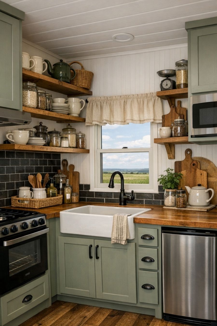 Despite its compact size, the kitchen in the Buttonwood Cottage RV Camper is both functional and charming. Classic shaker cabinets painted in a soft sage green provide ample storage, while open shelving allows for the display of beautiful dishware and vintage kitchen tools. The countertops are a warm butcher block, offering both durability and a natural aesthetic. A small farmhouse sink under the window provides a picturesque spot for washing up, with the view extending out to the horizon. All appliances are seamlessly integrated, ensuring that the kitchen remains uncluttered and easy to use.