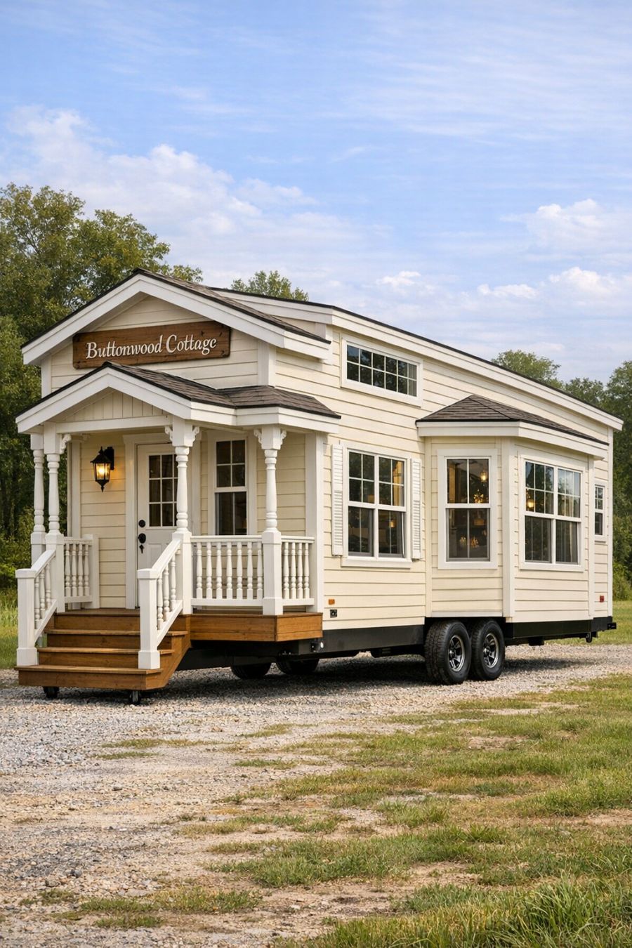 The exterior of the Buttonwood Cottage RV Camper is an exquisite blend of traditional charm and modern functionality. Its warm ivory siding is both inviting and timeless, offering a soft and welcoming façade. Delicate spindle accents add a touch of elegance and craftsmanship, reminiscent of classic country homes. Large, strategically placed windows ensure that the interior is always bathed in natural light, creating a seamless connection with the outdoors. The design also includes a quaint, porch-like entrance, providing a perfect spot to relax and enjoy the surrounding scenery.