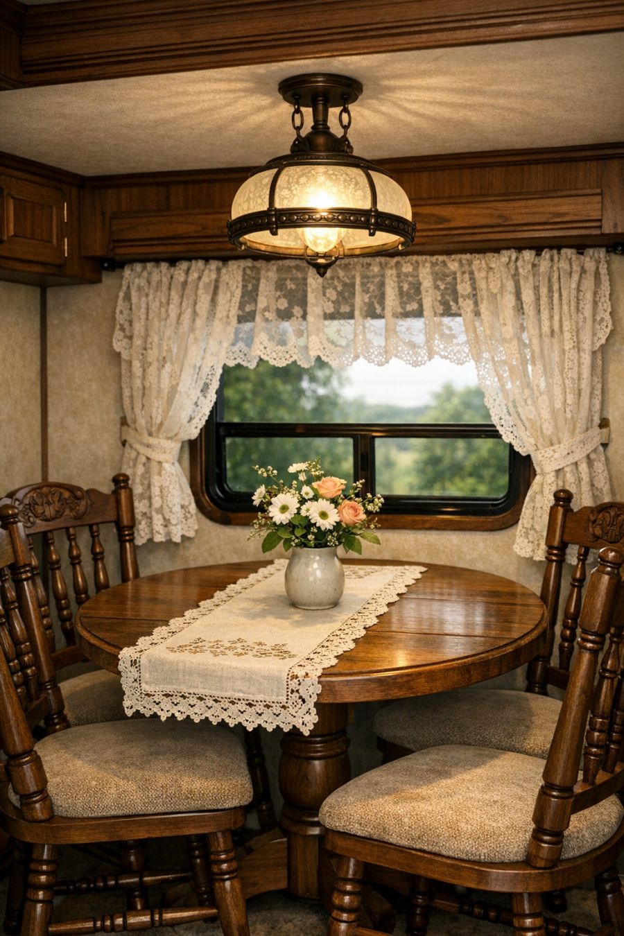 The dining area is a quaint nook that perfectly balances form and function. A compact, round wooden table serves as the centerpiece, surrounded by chairs with intricately carved backs that echo the spindle detailing found throughout the camper. The lighting overhead is a vintage-inspired fixture, casting a warm glow that invites lingering over meals. Delicate lace curtains frame the window, through which you can enjoy the ever-changing views. Thoughtful touches like a handcrafted table runner and a small vase with fresh flowers add a personal and homely touch.