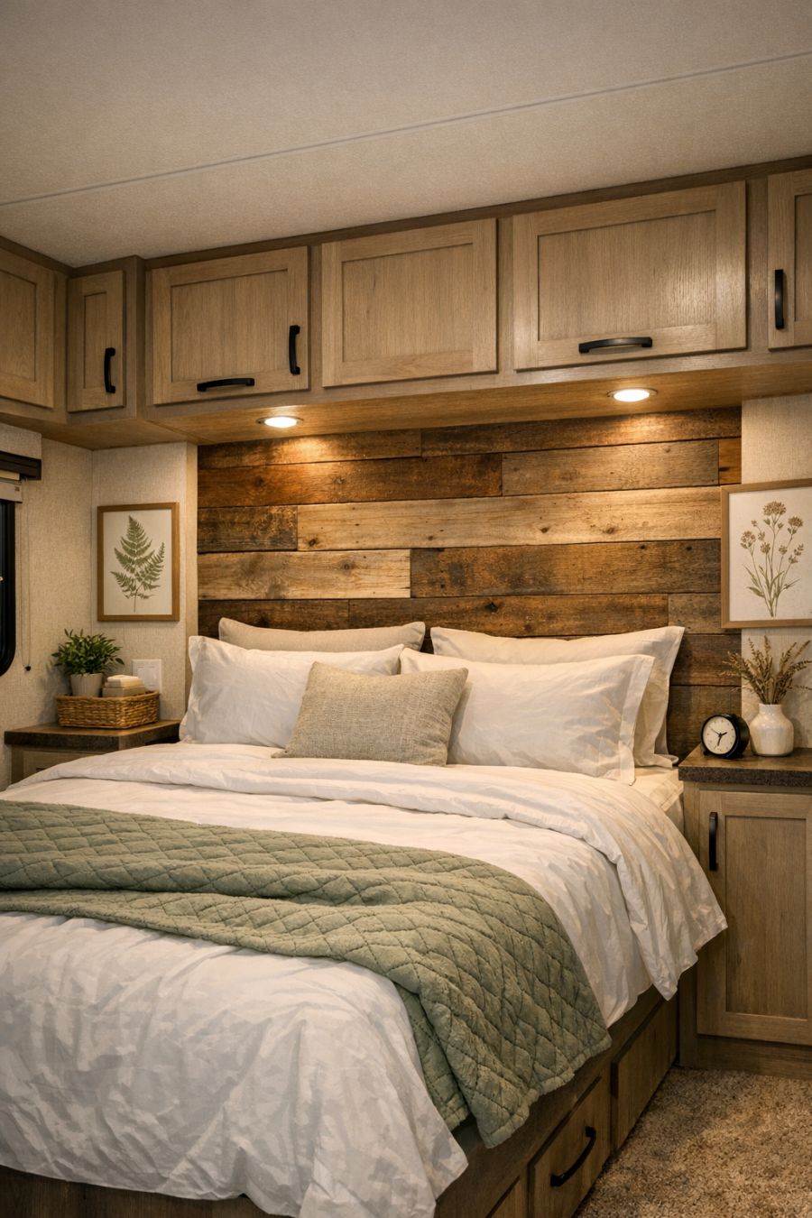 The bedroom area is a cozy retreat, designed with rest and relaxation in mind. A snug double bed is dressed in crisp white linens, with a quilted throw adding a layer of comfort and warmth. The headboard features a panel of reclaimed wood, bringing in a rustic element that ties in with the rest of the interior. Built-in storage solutions ensure that the space remains tidy and uncluttered, while soft, ambient lighting creates a soothing atmosphere. The walls are adorned with botanical prints, enhancing the connection to nature and fostering a sense of serenity.