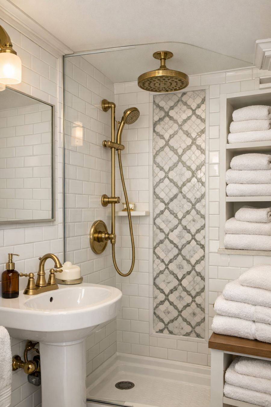 The bathroom in the Buttonwood Cottage RV Camper is a study in efficient design and timeless style. Clad in classic white subway tiles, the space feels clean and bright. A small, pedestal sink offers functionality without taking up too much room, while a frameless mirror above reflects light and creates an illusion of space. The shower is compact yet luxurious, featuring a rain showerhead and intricate mosaic tile accents. Brass fixtures add a touch of vintage charm, and soft, fluffy towels are neatly stacked on open shelves, ready for use.