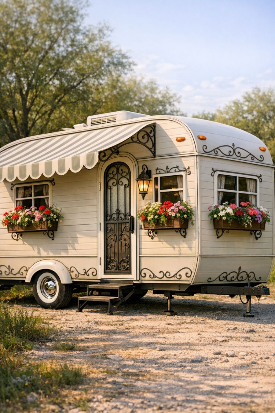 The exterior of this RV camper is a delightful sight to behold, featuring light shell siding that glows warmly in the sunlight. Its vintage garden gate design is complemented by a gracefully curved awning, providing both shade and an aesthetic flair that harks back to classic caravans of the past. The siding's soft, neutral tones are accentuated by decorative elements that mimic wrought iron, adding a touch of elegance. This charming exterior is perfectly finished with quaint window boxes brimming with vibrant flowers, bringing a dash of nature's beauty to the mobile home.
