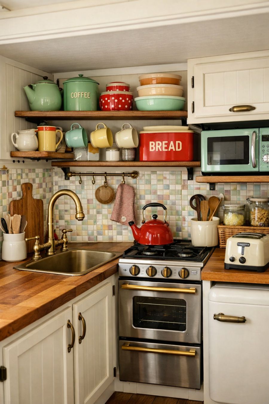 In the kitchen, functionality meets vintage charm with an array of design elements that cater to both. The countertops are crafted from butcher block wood, providing a warm, earthy tone that complements the white cabinetry. Antique brass fixtures add a touch of elegance to the sink area, while open shelving displays a collection of retro kitchenware. The backsplash is a mosaic of soft pastel tiles, creating a cheerful and inviting atmosphere. Despite its compact size, this kitchen is equipped with all the essentials, ensuring that every culinary adventure is a delight.