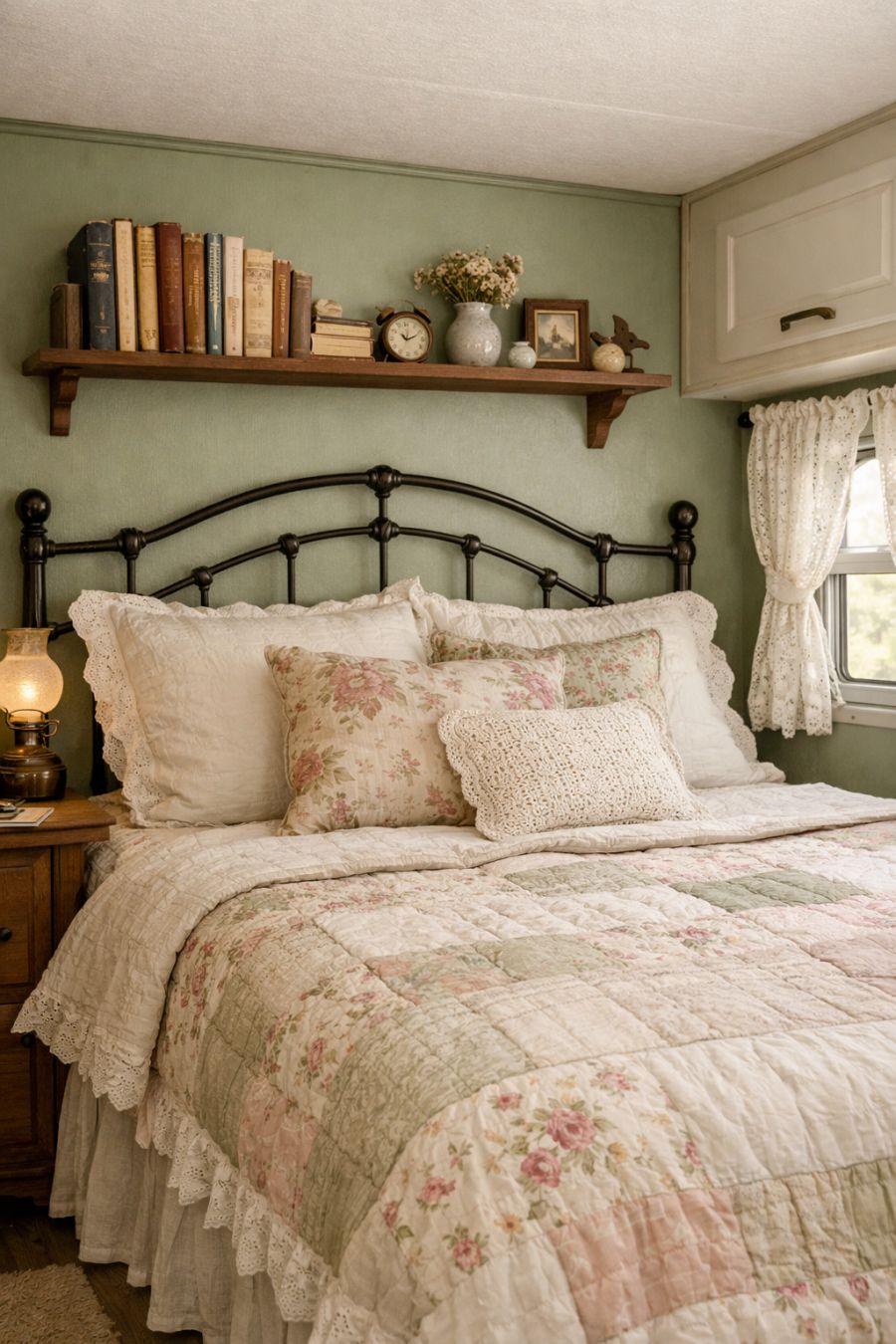 The bedroom area is a serene retreat designed for restful nights and peaceful mornings. A cozy bed with a wrought iron frame is dressed in vintage-inspired linens, creating a soft and inviting sleep space. The walls are painted in a calming shade of sage green, enhancing the tranquil ambiance. Above the bed, a small shelf holds a selection of beloved books and a few personal trinkets. Natural light filters in through a small window adorned with lace curtains, adding to the room's gentle, airy feel.