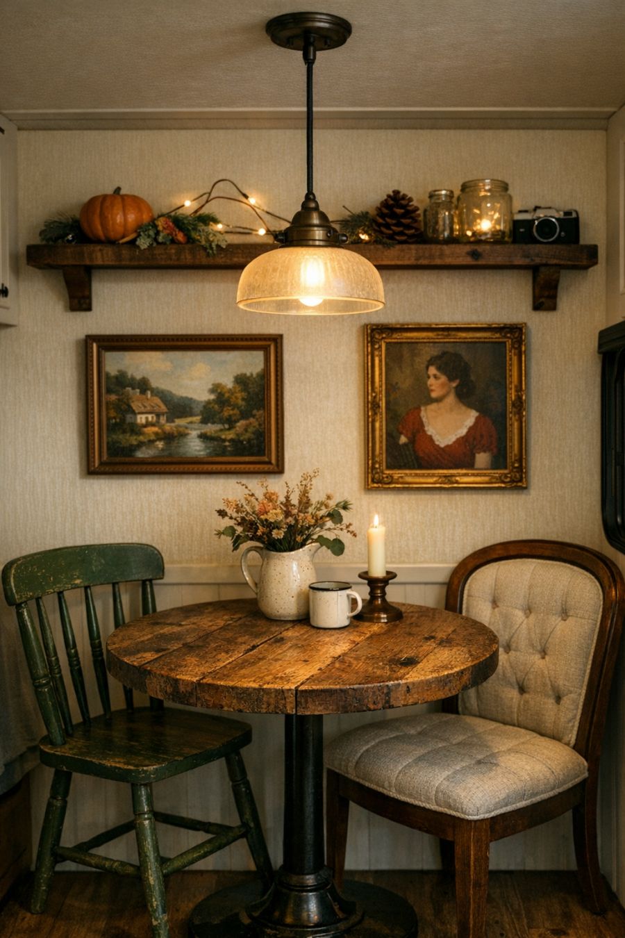 The dining area, though compact, is a testament to thoughtful design and style. A small, round table made of reclaimed wood sits at the heart of this space, surrounded by two mismatched chairs that enhance its vintage appeal. Above the table, a delicate pendant light hangs, providing ample illumination for intimate meals. The walls are adorned with a few pieces of vintage artwork, adding personality and color to the area. A narrow shelf offers a spot for seasonal decorations or cherished mementos, making this dining nook feel truly personalized.