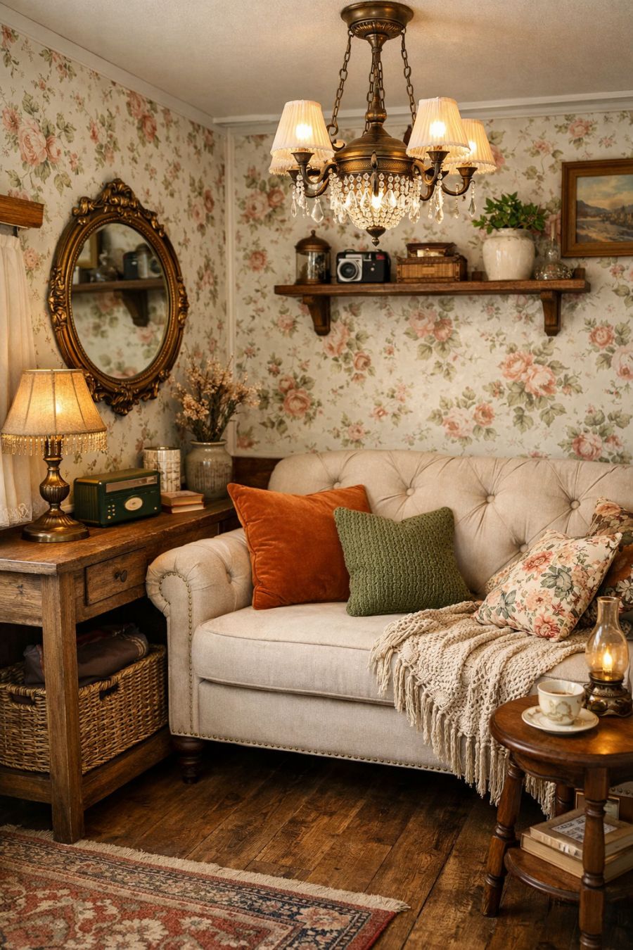Step inside the living area and be greeted by a cozy yet stylish space that blends vintage charm with modern comfort. The walls are adorned with floral wallpaper that adds a touch of whimsy, while the hardwood floors exude warmth and sturdiness. A plush loveseat is positioned against one wall, inviting relaxation and conversation, surrounded by carefully curated vintage decor items. A small, elegantly framed mirror hangs above a rustic wooden console, reflecting the soft glow of a vintage-inspired chandelier that casts a gentle light throughout the space.