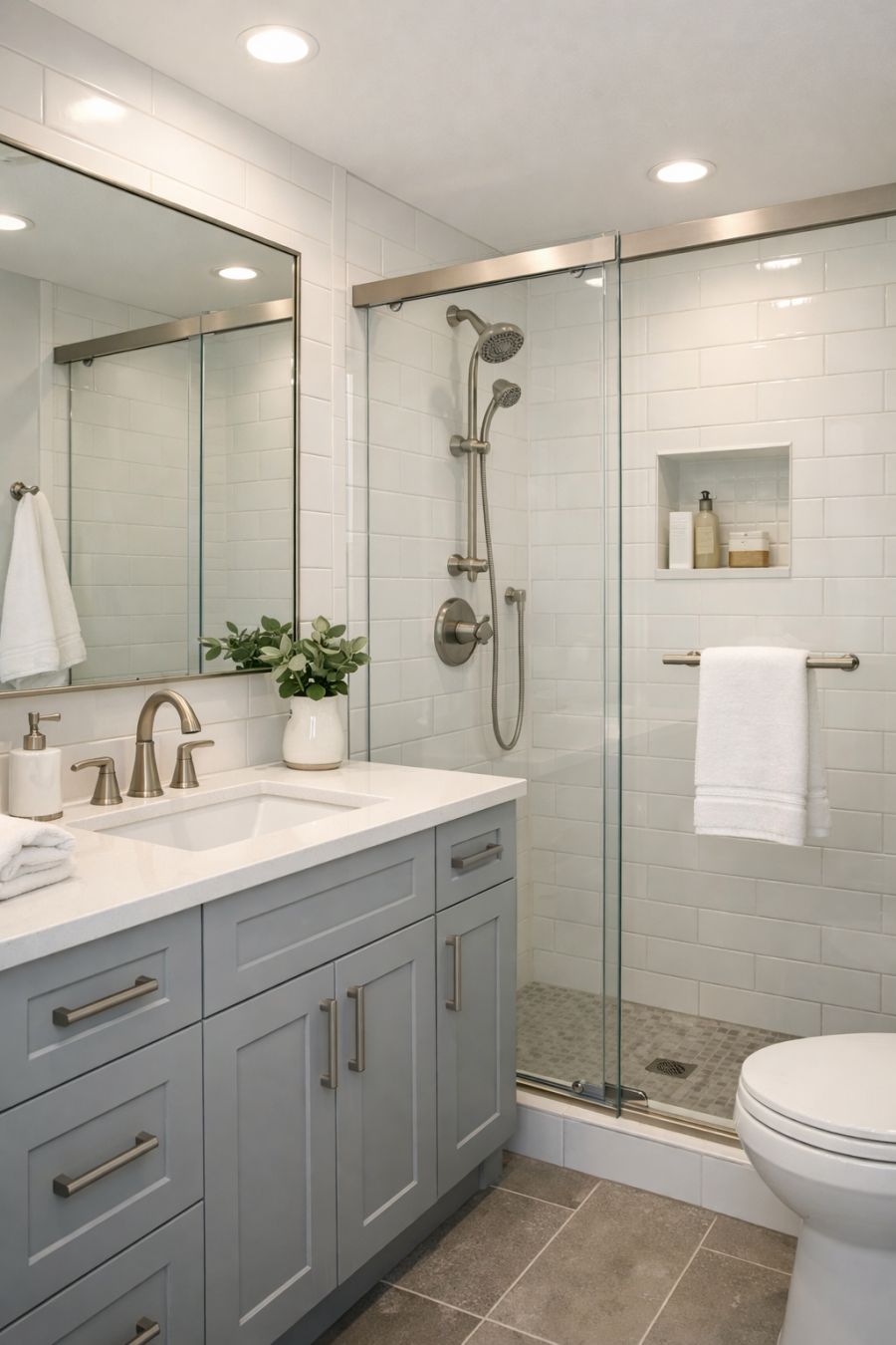 The bathroom combines functionality with a touch of luxury, featuring high-quality materials and thoughtful design. The color scheme is clean and neutral, with white tiles and soft gray accents creating a fresh and modern look. A spacious walk-in shower with a glass door adds a sense of openness, while a sleek vanity with ample storage keeps the space organized. Fixtures in brushed nickel add a touch of elegance, and a large mirror enhances the sense of light and space. This bathroom is a testament to the home's commitment to style and practicality.