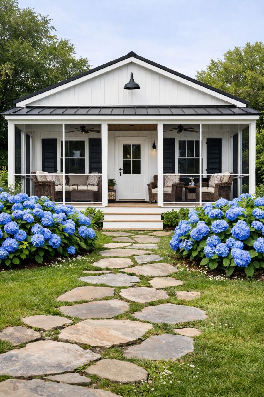 The exterior of this charming farmhouse-style container home is a sight to behold. Its pristine white façade is complemented by striking black shutters, creating a timeless and elegant look. A large screened-in front porch stretches across the front, furnished with comfortable wicker furniture that invites you to sit and enjoy a leisurely afternoon tea. Surrounding the home are lush blue hydrangea bushes, adding a pop of color and vibrancy to the setting. A stone path meanders through the garden, guiding visitors toward the welcoming entrance.