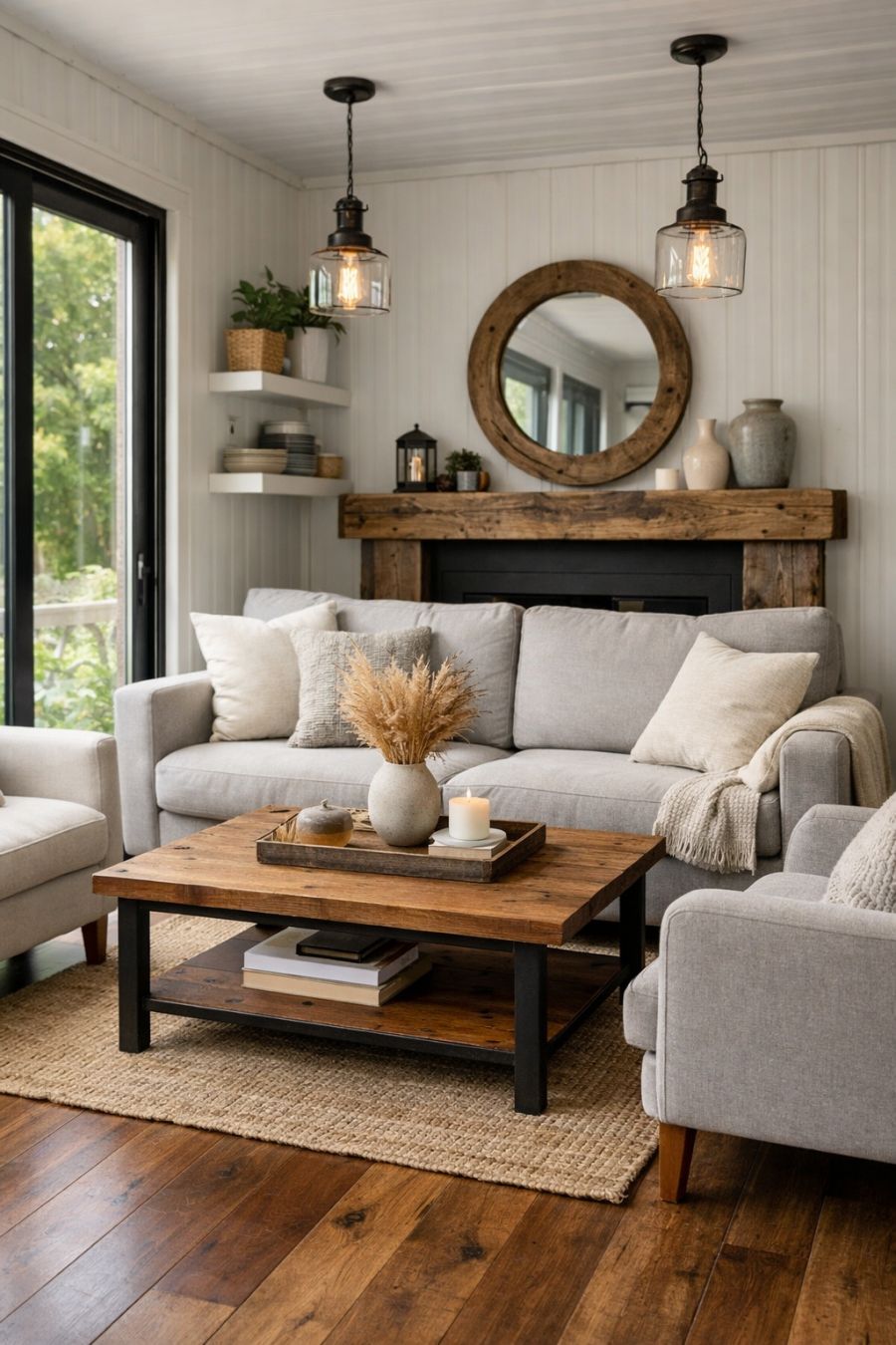 Step inside, and you're greeted by an open floor plan that is both breathtaking and inviting. The living area is designed with a neutral color palette, featuring soft grays and whites that create a serene atmosphere. Large windows allow natural light to flood the space, enhancing the warmth of the rich wooden floors. A cozy sofa and armchairs are arranged around a simple coffee table, providing a perfect spot for relaxation or conversation. The minimalist décor is accented with rustic touches, such as a reclaimed wood mantel and vintage-inspired lighting fixtures.