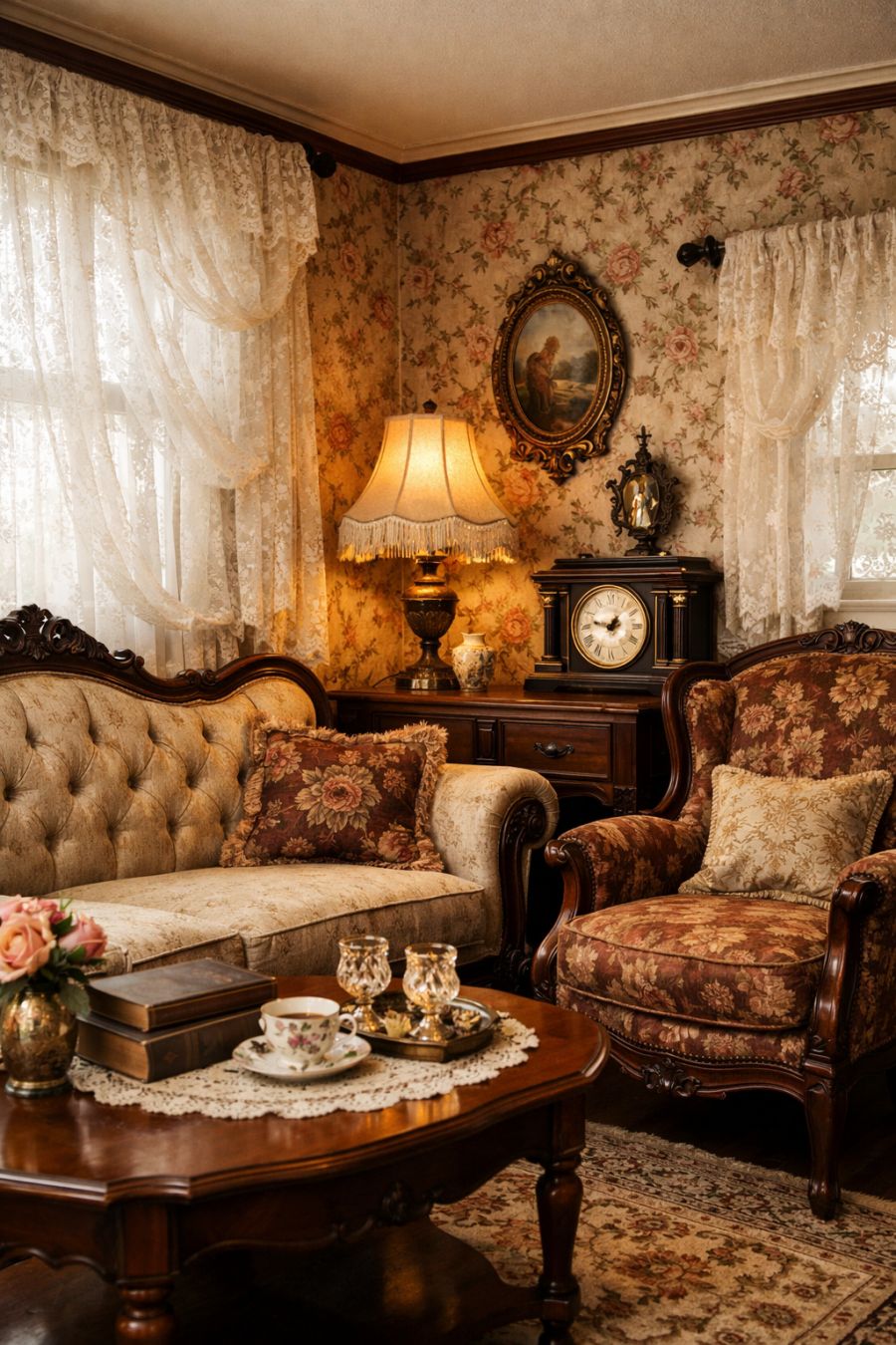 Stepping into the living area, one is immediately transported into a world of vintage elegance. The room is adorned with floral wallpaper that harks back to Victorian times, setting a sophisticated yet cozy atmosphere. Lace curtains drape gracefully over the windows, filtering in soft, diffused light that adds warmth to the space. Antique furniture and plush seating arrangements invite relaxation, with every detail thoughtfully placed to create a harmonious and inviting ambiance.