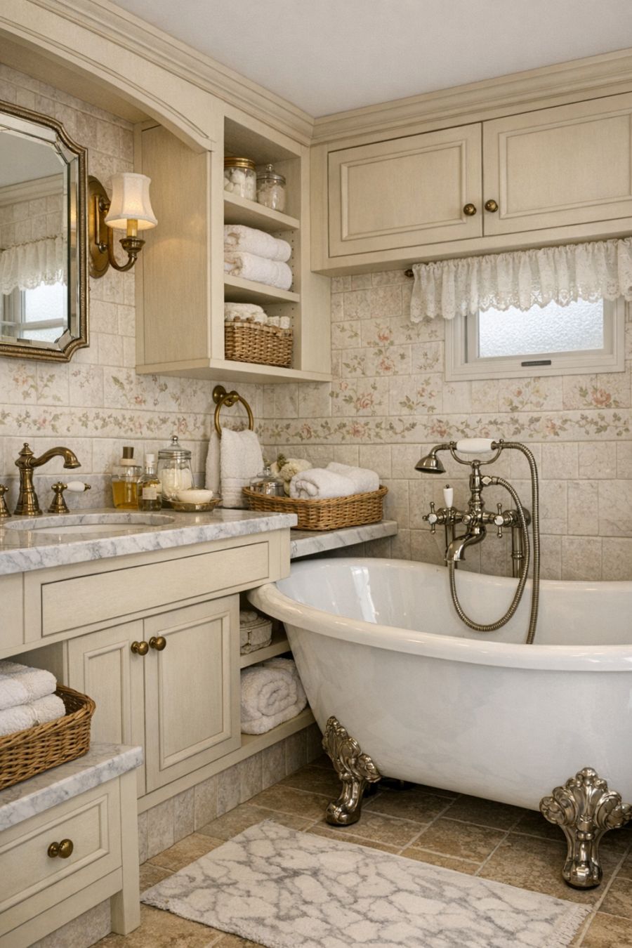 The bathroom is a study in elegance and functionality, with every detail carefully considered. Marble countertops provide a luxurious surface, while vintage-style faucets and fixtures add a touch of historical charm. The walls are adorned with delicate floral tiles, complementing the overall design theme. A clawfoot bathtub stands as a centerpiece, offering a perfect spot for relaxation, with plenty of storage solutions subtly integrated to maintain a clutter-free space.