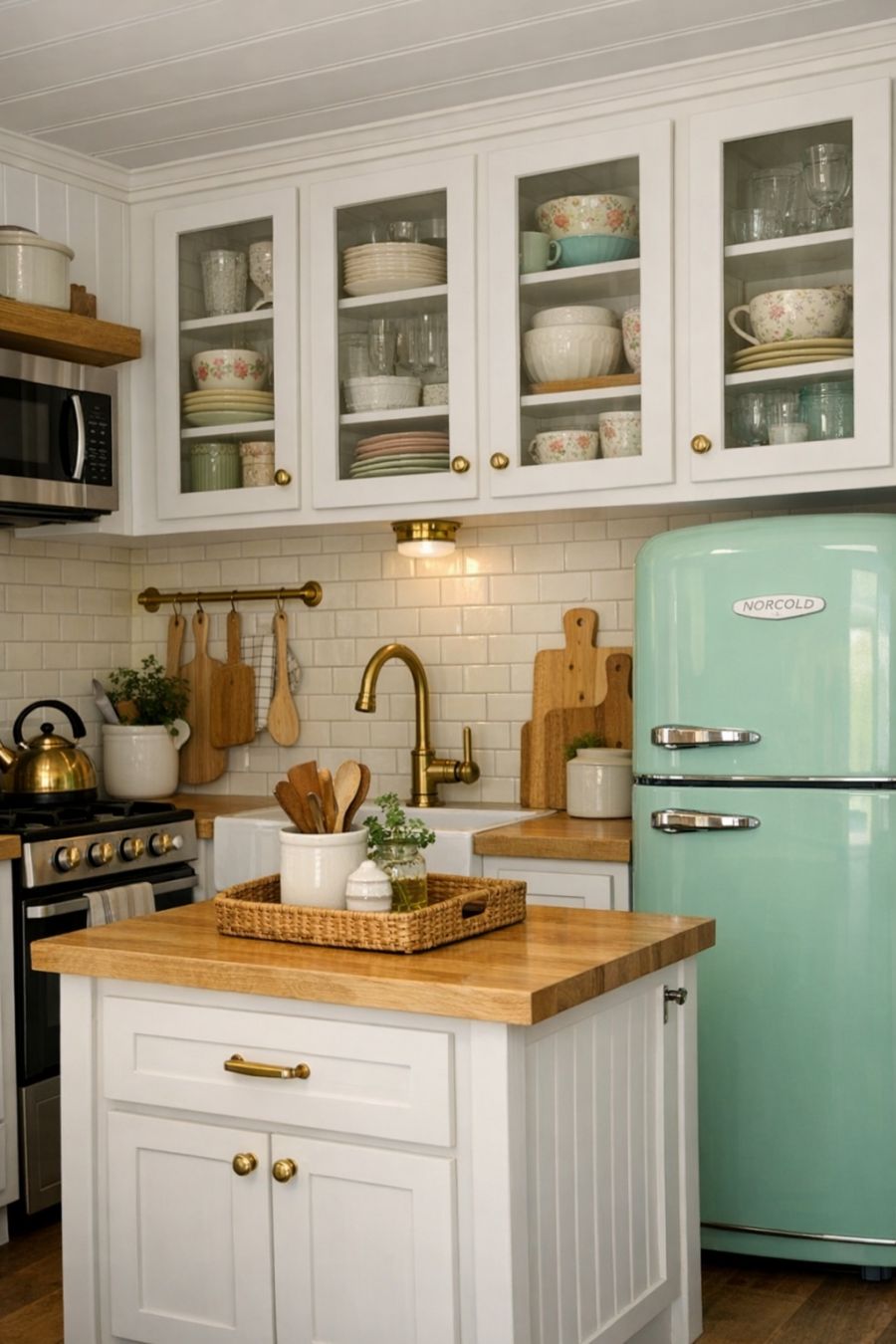 The kitchen, though compact, is a marvel of design and functionality. White cabinets with glass fronts reveal neatly organized vintage dishware, while brass fixtures add a touch of warmth and elegance. Subway tiles in a soft cream color line the walls, providing a clean and timeless backdrop. A small, but efficient, island offers additional workspace, with a charmingly retro refrigerator completing the look of this delightful culinary space.