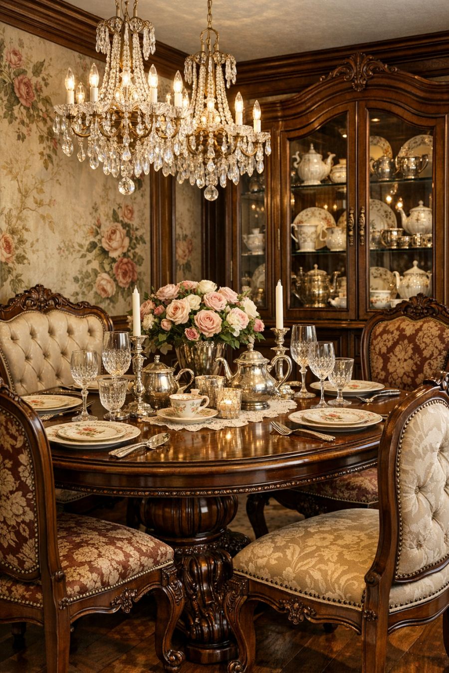 The dining area continues the theme of Victorian opulence, with a beautifully crafted wooden dining table taking center stage. Surrounding it are elegantly upholstered chairs that promise comfort during long, leisurely meals. Crystal chandeliers hang overhead, casting a gentle glow that enhances the floral motifs on the walls. Vintage china and silverware are displayed in an antique cabinet, adding a touch of history and class to this intimate dining space.