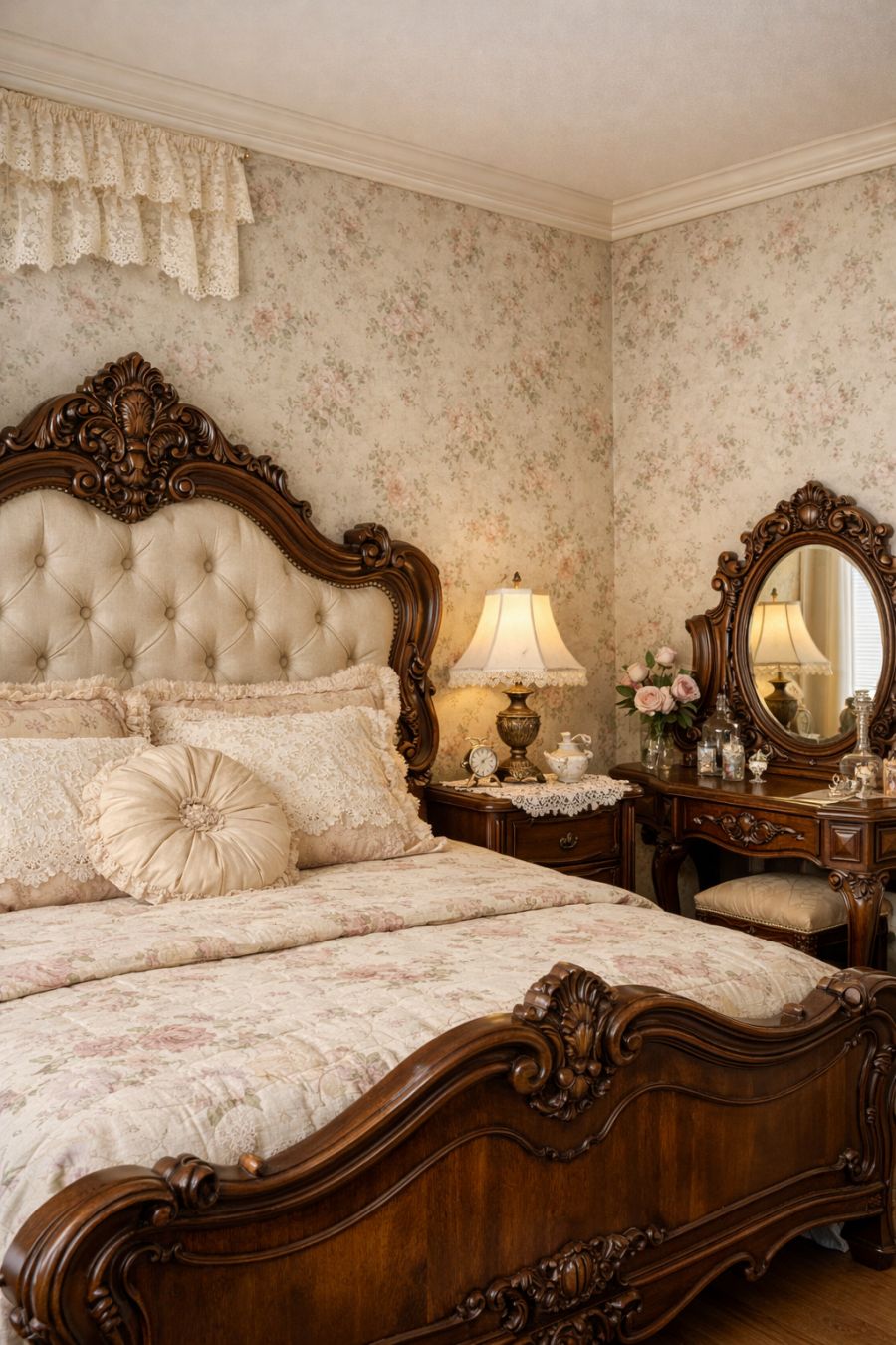 In the bedroom, the Victorian theme is continued with a large, ornate bed frame that invites rest and relaxation. The floral wallpaper here is more subdued, creating a serene atmosphere perfect for unwinding. Vintage bedside tables with lace doilies and classic lamps add to the charm, while a small, intricately carved vanity stands ready for morning routines. The use of soft, muted colors throughout ensures the room remains a peaceful haven.