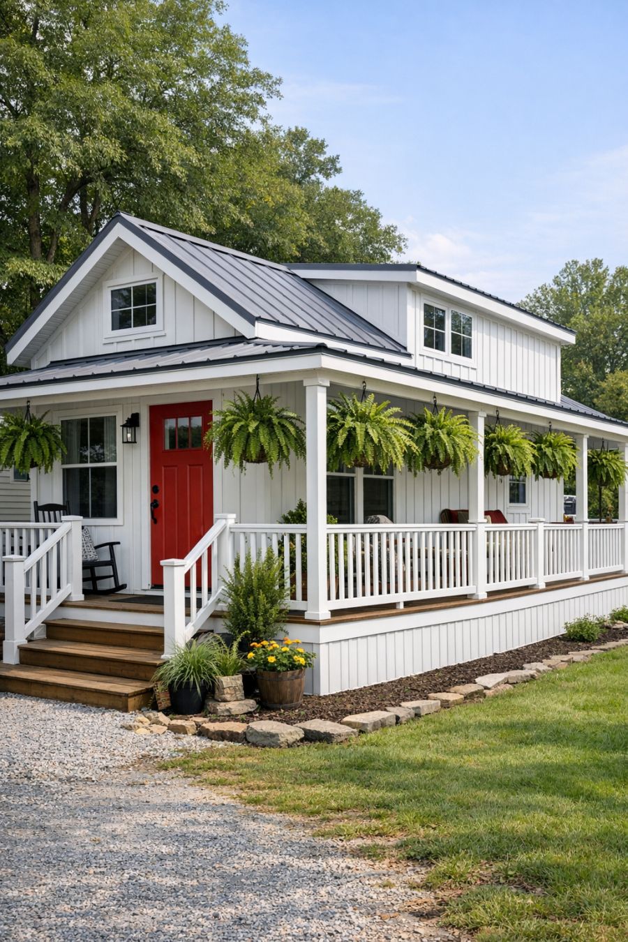 As you approach this delightful park model RV, you are greeted by a crisp white board and batten façade that exudes simplicity and charm. The vibrant red door stands out as a welcoming beacon, inviting guests to explore the treasures within. A wrap-around porch, embellished with an array of lush hanging fern baskets, adds a touch of greenery and life to the clean lines of the exterior. The 3/4 angled view captures the essence of a quaint farmhouse, yet hints at the surprises that await inside.