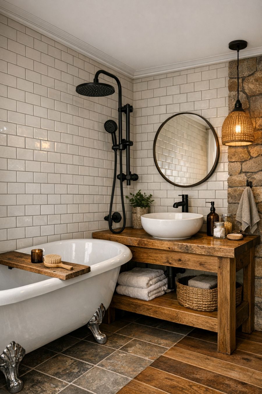 The bathroom in this cottage container home is a harmonious blend of style and practicality. The walls are adorned with subway tiles in a soft, neutral hue, providing a clean and timeless backdrop. A clawfoot bathtub stands as a centerpiece, offering a touch of vintage elegance. Modern fixtures, such as a sleek rain showerhead and a vessel sink, add contemporary flair and functionality. The use of natural materials, like a wooden vanity and stone accents, ties the bathroom to the rest of the home, creating a cohesive and inviting space. The overall atmosphere is one of calm and sophistication, making it a perfect place to unwind.