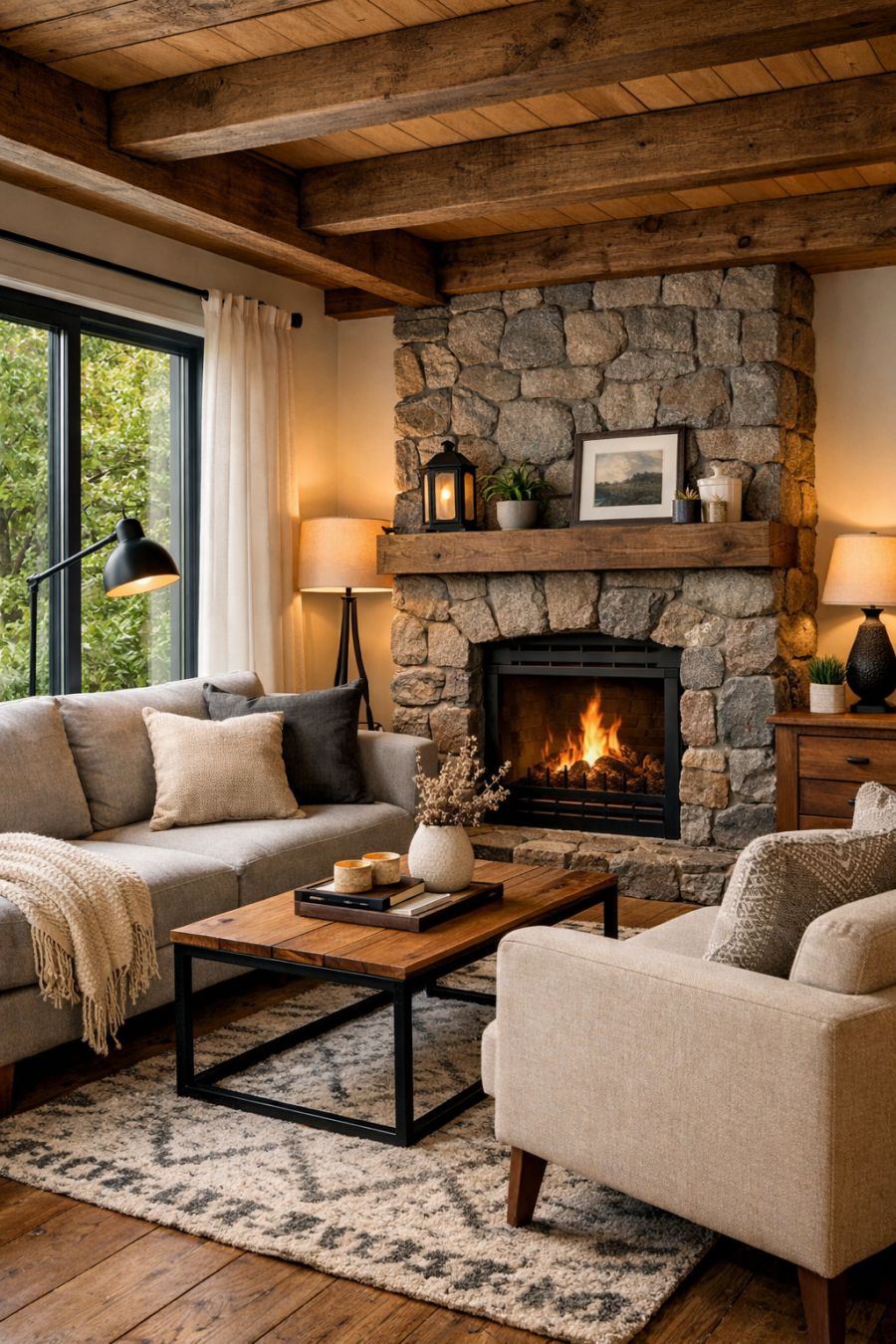Upon entering the home, you are welcomed into a living area that exudes warmth and character. The interior features exposed wooden beams and a stone fireplace, creating a cozy atmosphere reminiscent of a traditional cottage. Modern furniture pieces, with sleek lines and neutral tones, contrast beautifully with the rustic elements, offering a perfect blend of old and new. Large windows provide plenty of natural light, illuminating the space and offering views of the lush greenery outside. The use of soft textiles and strategically placed lighting fixtures further enhance the inviting ambiance of the room.