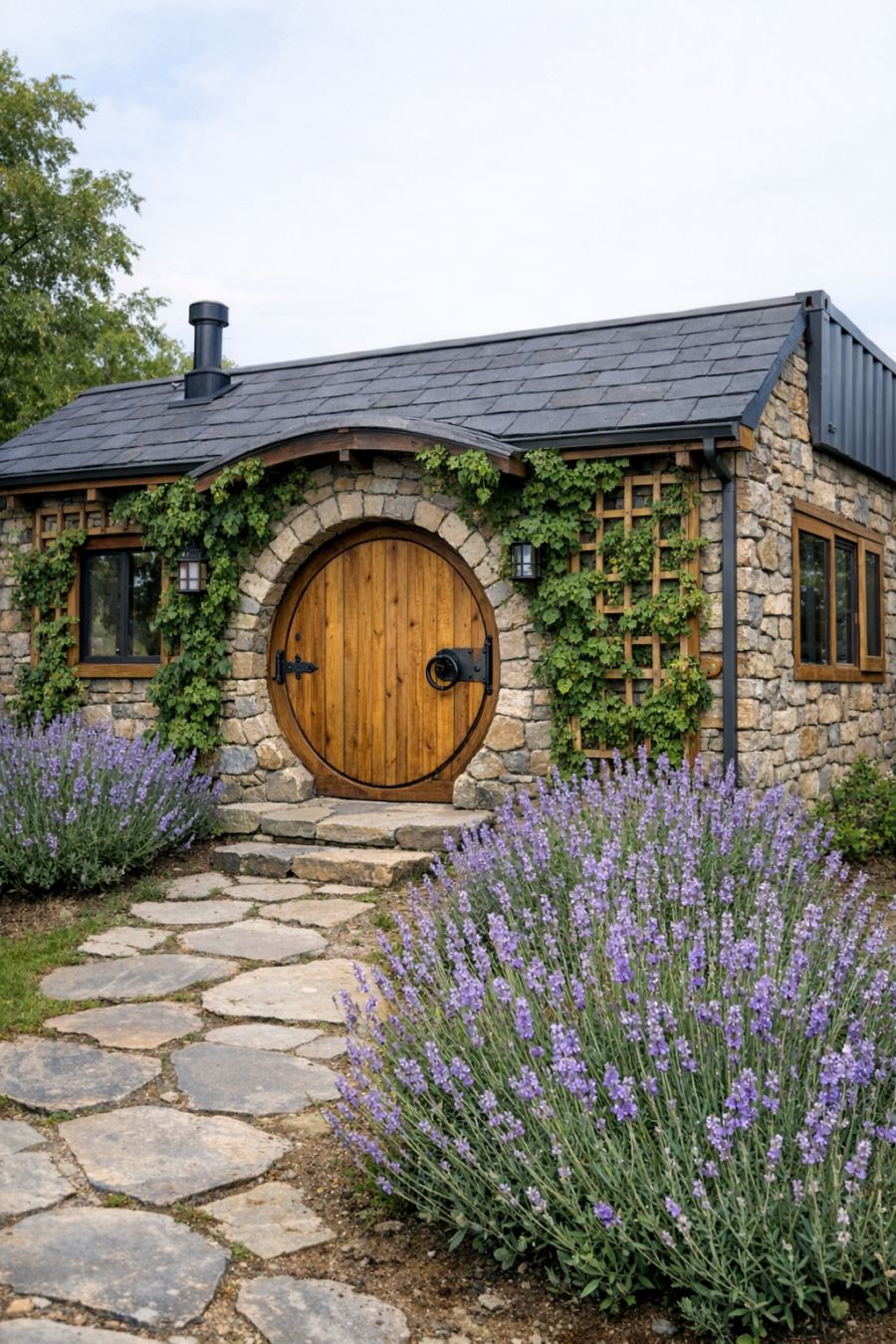 The exterior of this stone-clad cottage container home is nothing short of enchanting. Climbing ivy covers the wooden trellises, adding a touch of nature that softens the rustic stone facade. A round hobbit-style wooden door serves as a whimsical entryway, inviting guests into a world of charm and comfort. The slate gray roof complements the stone walls, while blooming lavender bushes line the path leading to the door, adding a splash of color and a delightful fragrance. Captured from a 3/4 angled view, this amateur photograph highlights the quaint yet elegant design of the home, showcasing its perfect blend of rustic and modern elements.