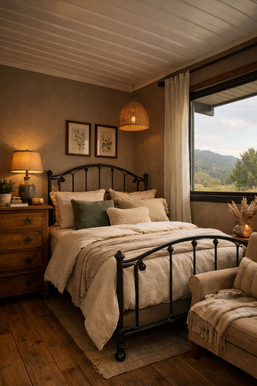 The bedroom is a serene retreat, designed to offer a peaceful escape from the outside world. A wrought iron bed frame, complete with soft linens and plush pillows, serves as the focal point of the room. The walls are painted in a muted earth tone, creating a calming atmosphere that promotes relaxation. A vintage wooden dresser and a cozy armchair add functionality and charm, while a large window offers views of the surrounding landscape. Soft lighting and natural materials enhance the tranquil feel of the space, making it a perfect haven for rest and rejuvenation.
