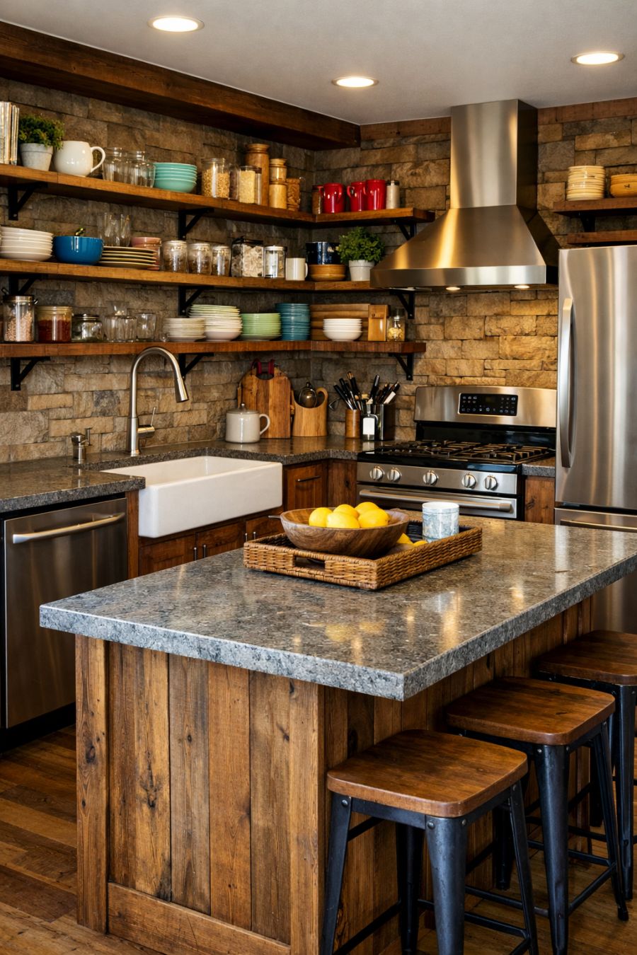 The kitchen is a blend of rustic charm and modern convenience, featuring a mix of natural materials and state-of-the-art appliances. Wooden cabinetry with a distressed finish adds character, while sleek stainless steel appliances provide functionality and a contemporary edge. The countertops are made of polished stone, complementing the stone elements found throughout the home. Open shelving displays an array of colorful dishes and glassware, adding a personal touch to the space. A large farmhouse sink and a central island with bar seating complete this kitchen, making it both a practical workspace and a social hub.