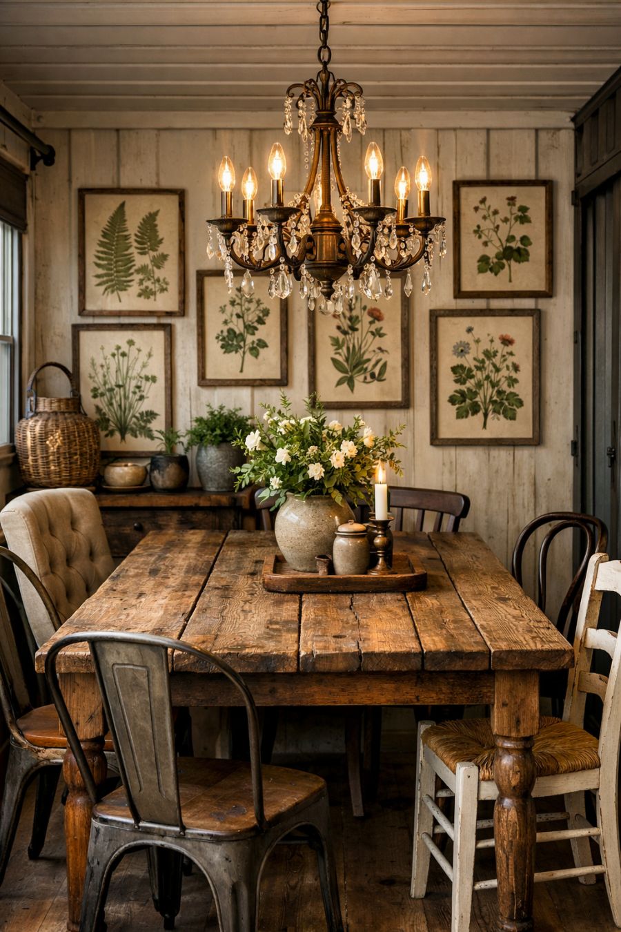 The dining area continues the theme of rustic elegance, with a reclaimed wood table serving as the centerpiece. Surrounding the table are mismatched chairs, each with its own unique design, adding an eclectic touch to the space. A vintage chandelier hangs overhead, casting a warm glow over meals shared with family and friends. The walls are adorned with botanical prints, bringing a touch of the outdoors inside and enhancing the natural feel of the home. This area is both functional and stylish, providing a perfect setting for both casual and formal dining.