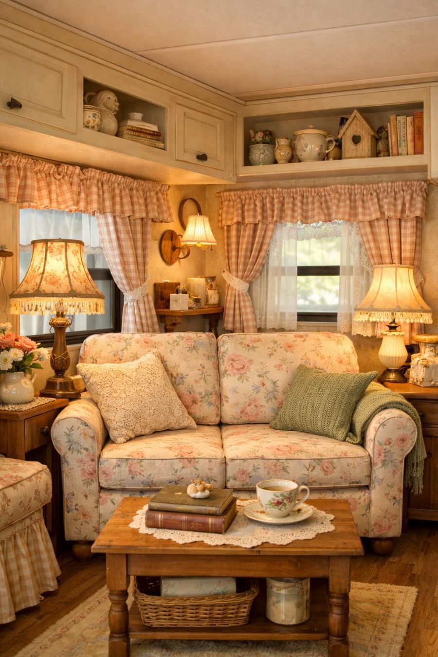 Step inside the living area and you're immediately enveloped in a cozy yet airy space. The walls are painted a soft cream, complementing the warm wooden flooring that runs throughout. A plush loveseat sits against one wall, upholstered in a pastel floral fabric that ties in with the gingham curtains. Vintage-inspired lamps cast a warm glow, highlighting the curated collection of knick-knacks and books on the built-in shelves. The overall style is a mix of shabby chic and cottagecore, creating a space that feels both lived-in and inviting.