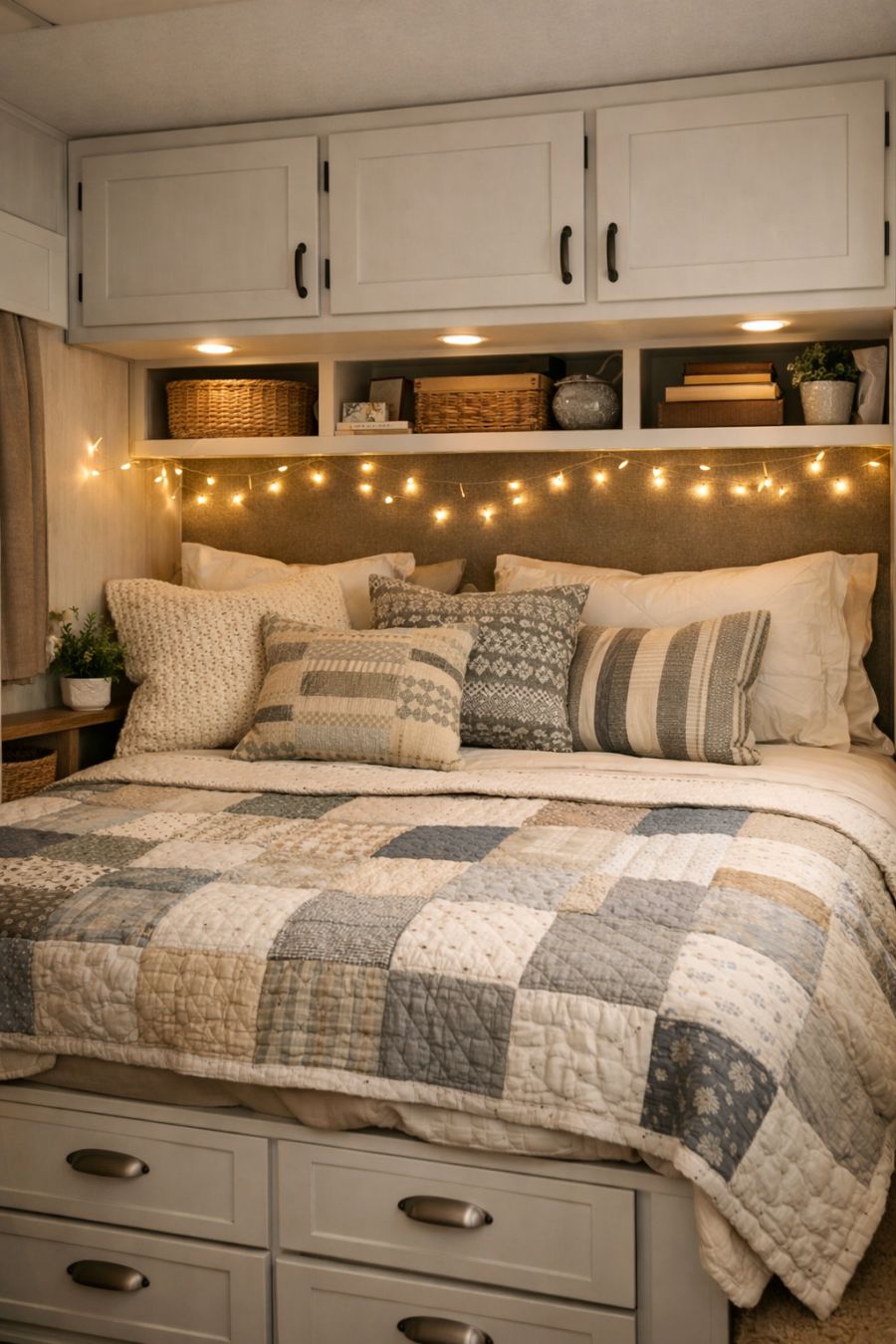 The bedroom area, though small, is a cozy retreat. A built-in bed with a plush mattress is adorned with an assortment of patterned throw pillows and a handmade quilt. Soft, neutral tones dominate the color palette, creating a calm and restful environment. Above the bed, a series of fairy lights provide gentle illumination, perfect for unwinding at the end of the day. Clever storage solutions are integrated into the design, with drawers beneath the bed and shelves above, ensuring everything has its place.