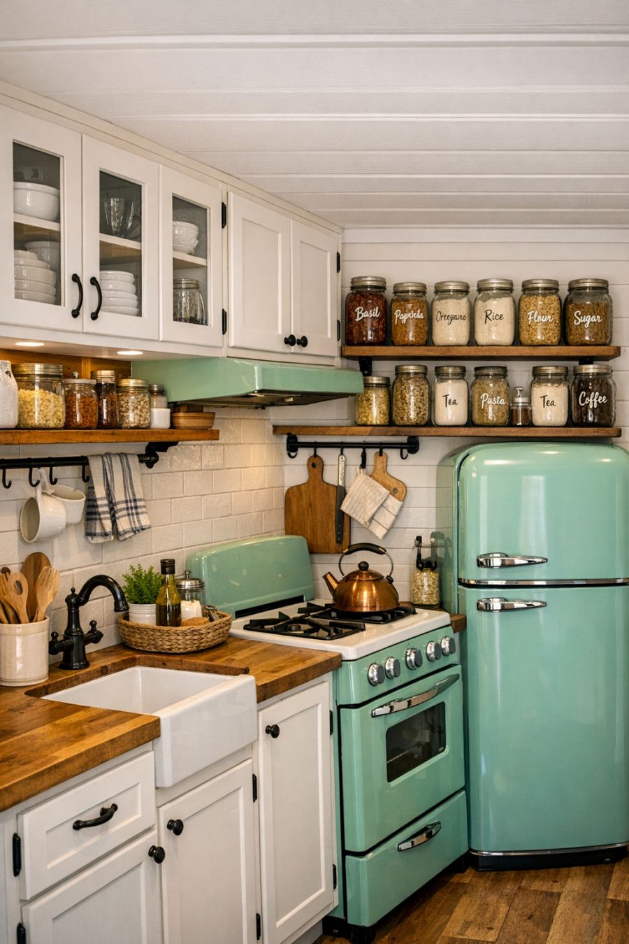 The kitchen is a marvel of compact design, featuring white cabinetry with glass-front doors that reveal neatly arranged dishware. Butcher block countertops provide ample space for meal preparation, while a small farmhouse sink adds to the rustic charm. Open shelving holds an array of jars filled with spices and dry goods, each labeled in a whimsical handwritten script. A vintage-style stove and refrigerator, both in a soft mint green, complete the look, offering modern convenience with a nostalgic twist.