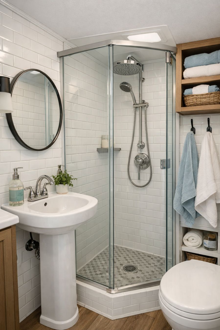 The bathroom, though compact, is a testament to thoughtful design. White subway tiles line the walls, providing a clean and timeless backdrop. A small pedestal sink fits snugly in one corner, paired with a round mirror that adds a touch of elegance. The shower, enclosed with glass panels, features a rainfall showerhead and hexagonal floor tiles that add visual interest. Storage is cleverly incorporated with open shelving and hooks for towels, ensuring functionality without sacrificing style. The color scheme of whites and soft blues creates a serene and refreshing atmosphere.