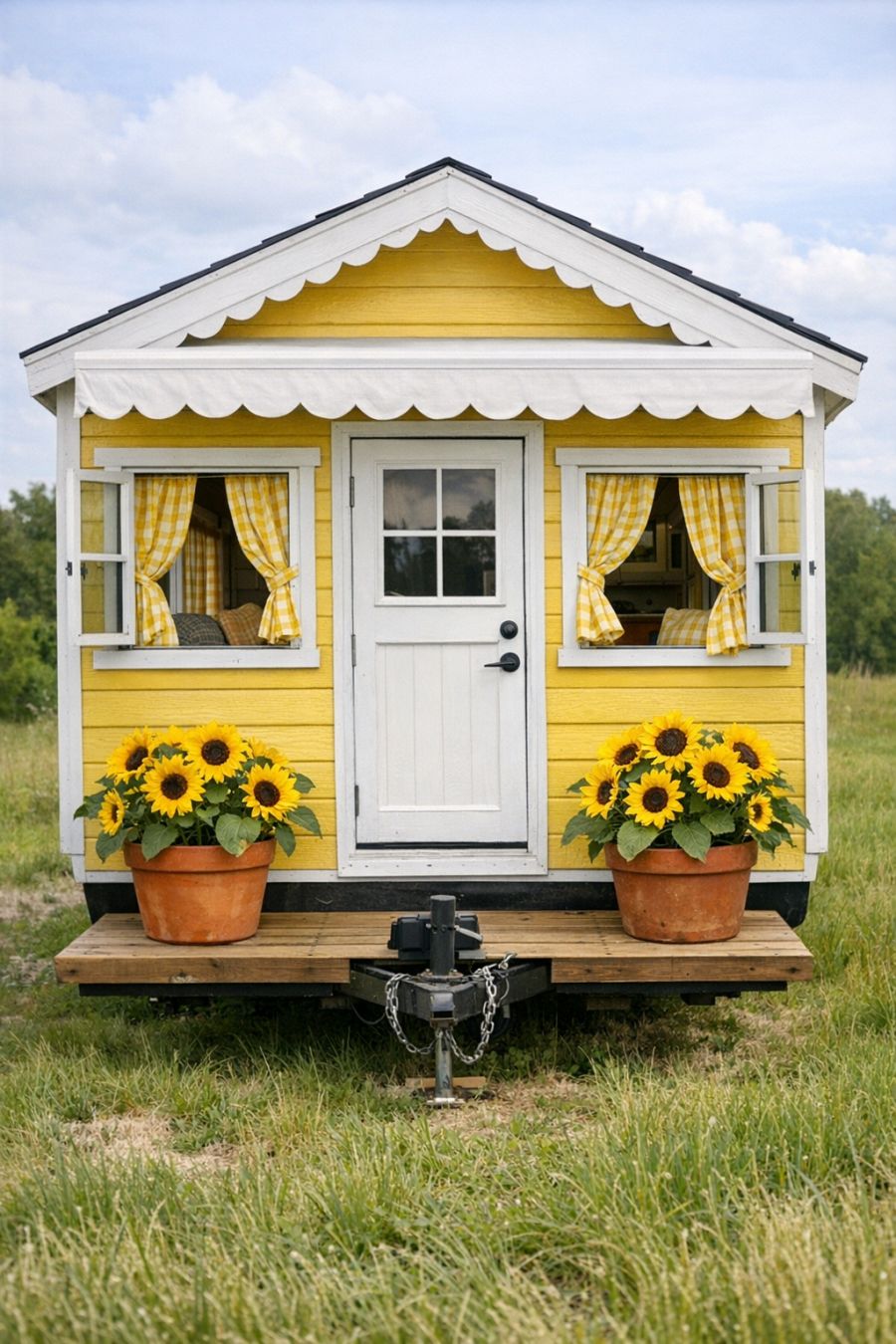 The exterior of the sunny yellow cottage RV camper is a delightful sight to behold. Its bright white wood trim provides a striking contrast to the vivid yellow, giving it a cheerful and inviting appearance. The open windows are adorned with yellow gingham curtains that flutter gently in the breeze, adding a touch of nostalgia and homeliness. Large potted sunflowers sit proudly on a small wooden deck, welcoming visitors with their sunny disposition. A scalloped white awning provides a quaint touch, while the whole scene is set against the backdrop of a lush grassy meadow, captured beautifully in an amateur photography style that emphasizes its rustic charm.