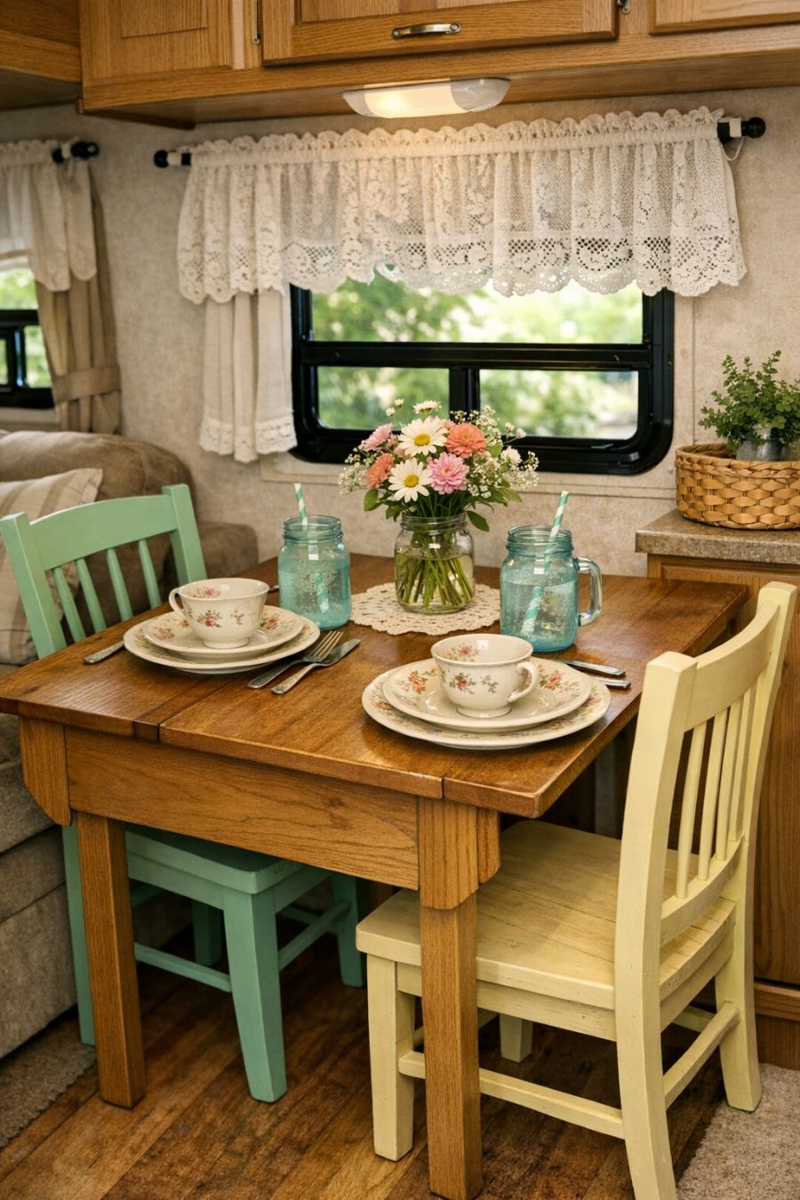 The dining area is a seamless extension of the living space, featuring a quaint wooden table with foldable sides to maximize space efficiency. Two mismatched chairs, each painted in a different pastel hue, add to the eclectic charm. The table is set with vintage china and mason jar glasses, ready for an impromptu meal with friends or family. A small window above the table allows natural light to stream in, while a dainty lace curtain adds a touch of elegance. The decor is simple yet thoughtful, with fresh flowers often gracing the table.