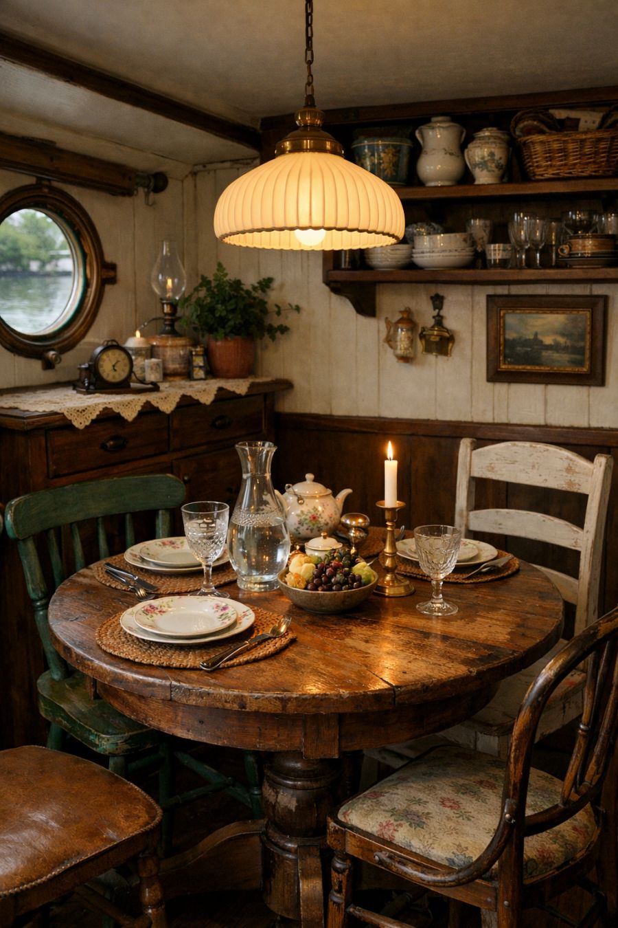 The dining area is a quaint nook designed for intimate gatherings and leisurely meals. A small, round wooden table with a distressed finish is surrounded by mismatched chairs, each with its own story to tell. The table is set beneath a charming, retro pendant light that casts a warm glow, perfect for cozy dinners. Vintage china and glassware add a touch of elegance, while a small sideboard provides additional storage for dining essentials and decorative treasures.