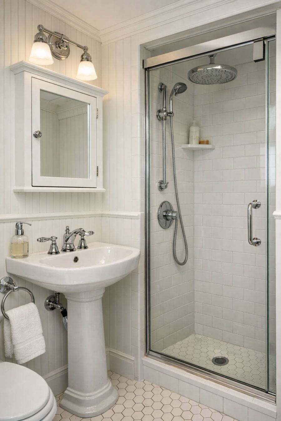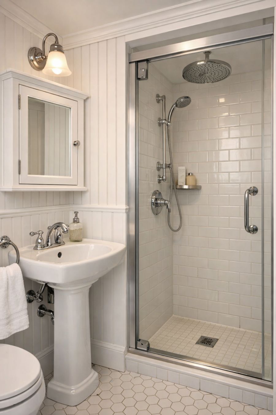 The bathroom is a compact yet stylish space, featuring classic design elements that ensure both functionality and aesthetic appeal. White hexagonal floor tiles and beadboard walls evoke a timeless look, while chrome fixtures add a touch of modernity. A small pedestal sink maximizes space, while a built-in medicine cabinet provides essential storage. The shower, enclosed by a glass door, features simple white tiles and a rainfall showerhead, offering a luxurious experience in a serene setting.